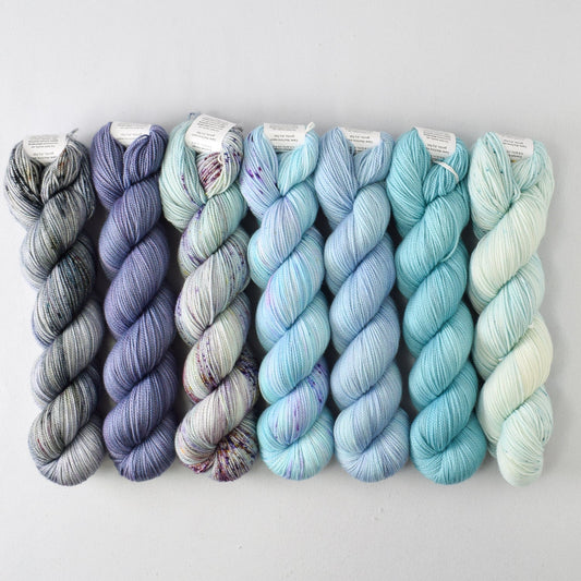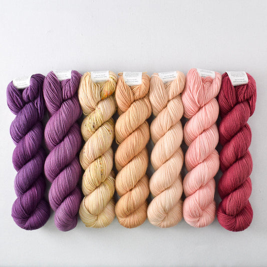 Seven full skeins of some of our fingering weight yarns, including Yummy 2-Ply, Yet, or Caroline, selected by someone here in the studio to create a lovely Find Your Fade or another large pattern with a flow of color. "Mixed" sets include Yummy 2-Ply and sparkly Estrellita. All patterns are sold separately and not included with the purchase of yarn.