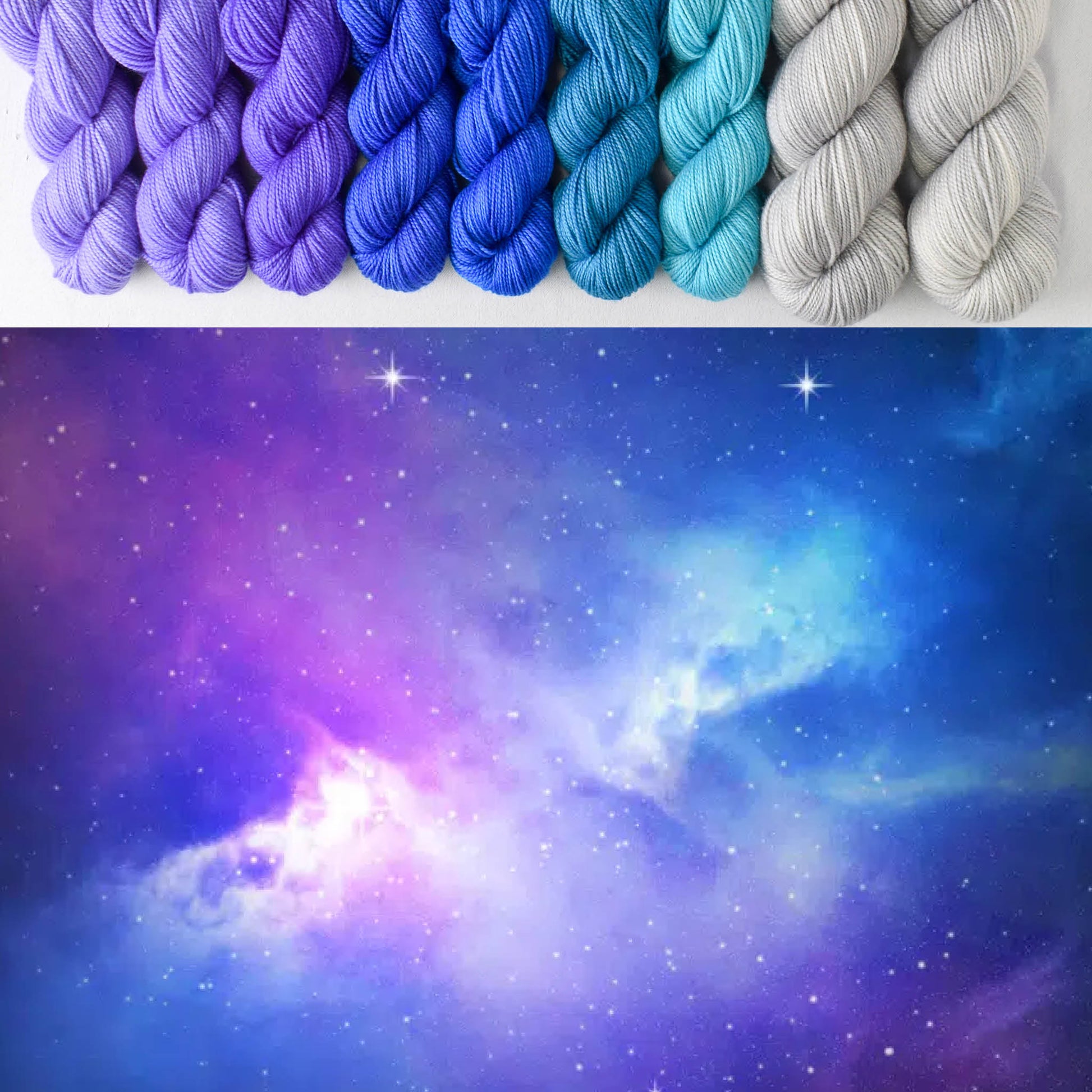 This set contains enough Yummy 2-Ply fingering weight superwash merino wool yarn to make the Cosmic Connections MKAL pattern by Lisa K. Ross: Two full skeins of the main color and one Toe each of 7 contrast colors. All patterns are sold separately.
