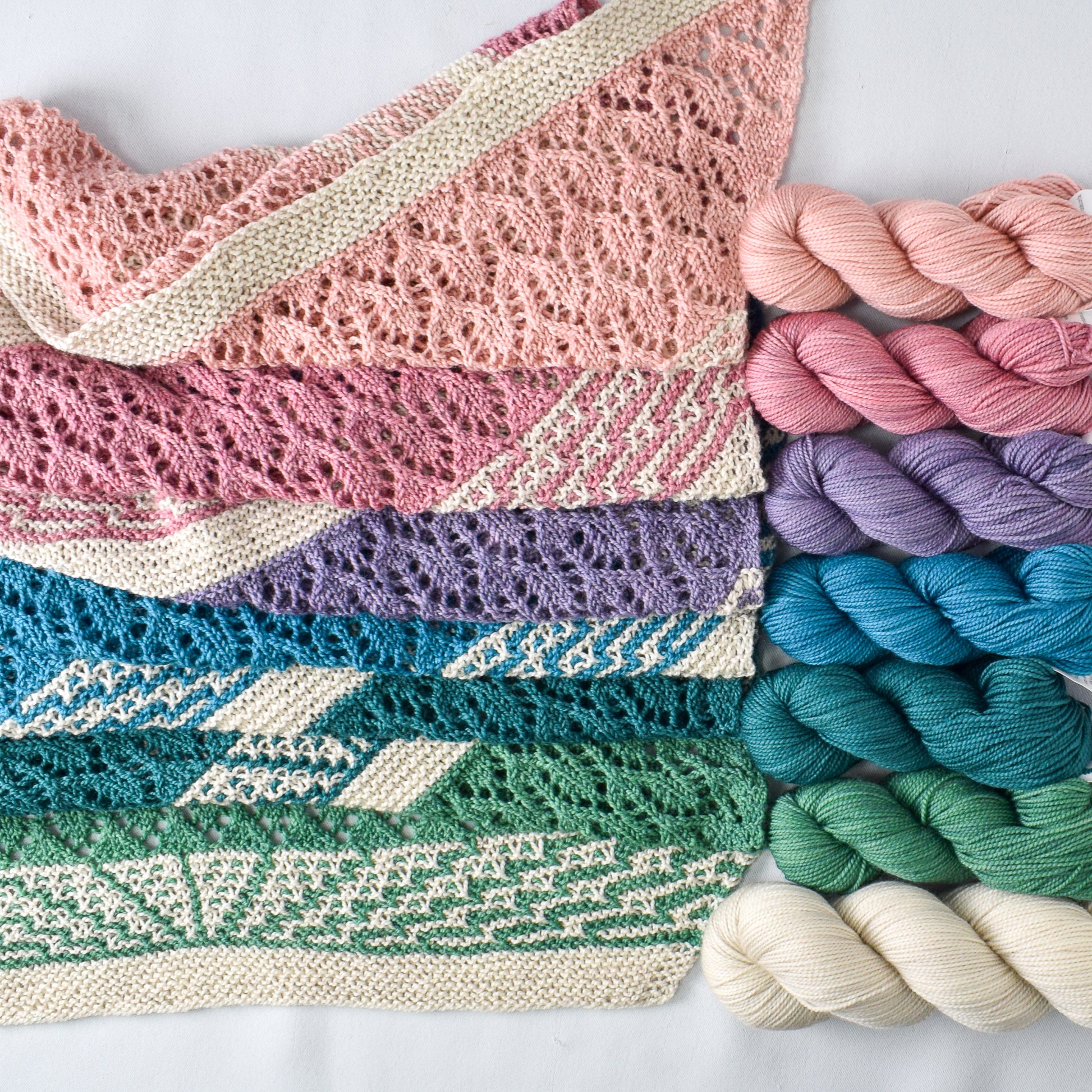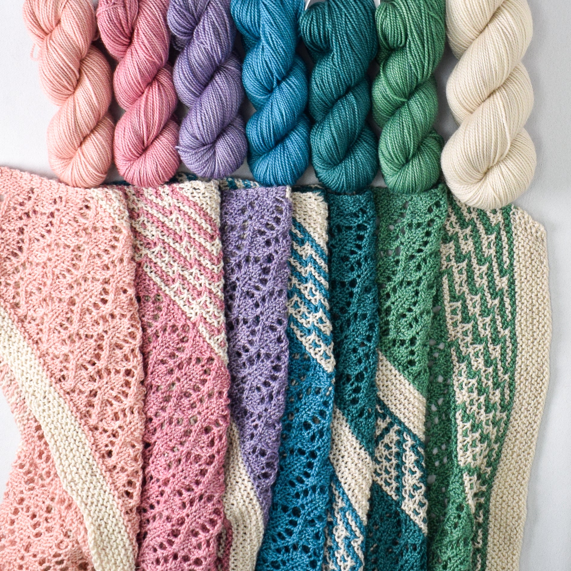 Six skeins of our Yummy 2-Ply Toes, dyed in a tonal gradient from light to dark.