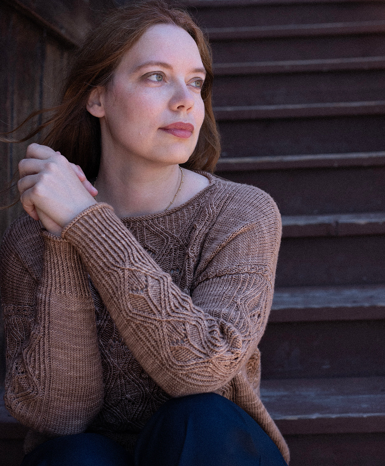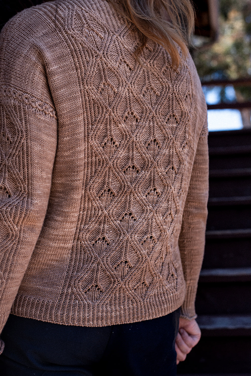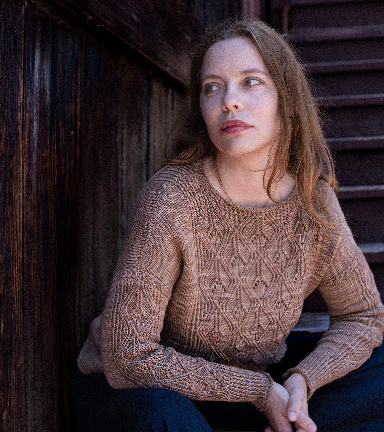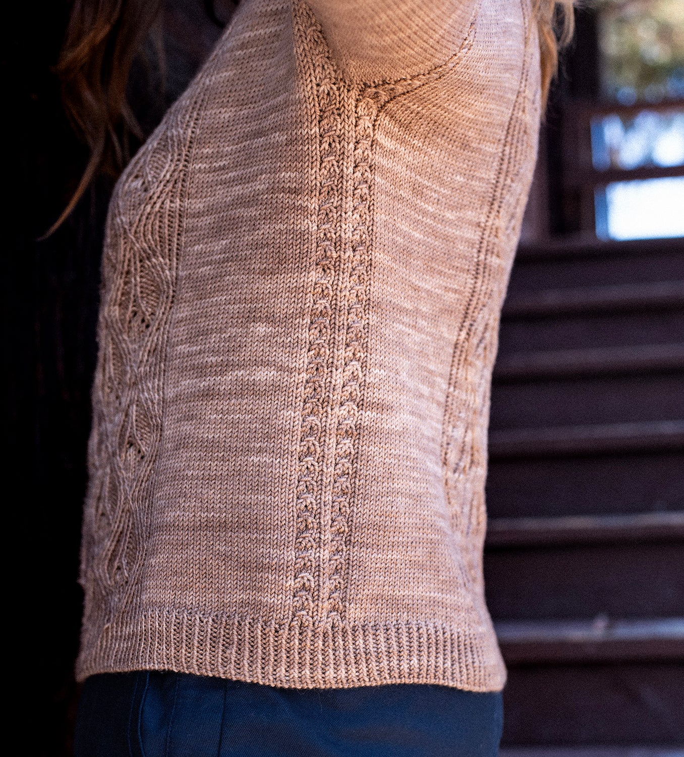 The Apato Pullover is a modern top-down sweater that blends clean stockinette fabric with striking twisted stitch cable panels. The design features bold vertical motifs on the front, back and sleeves, framed by simple lines that keep the look balanced and wearable. Worked seamlessly from the neckline down, Apato allows easy customization of body and sleeve length while maintaining a polished finish. With its flowing cables and versatile silhouette, this pullover is both engaging to knit and effortless to wear.