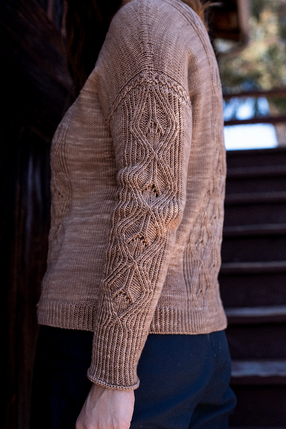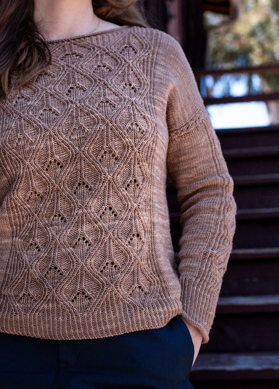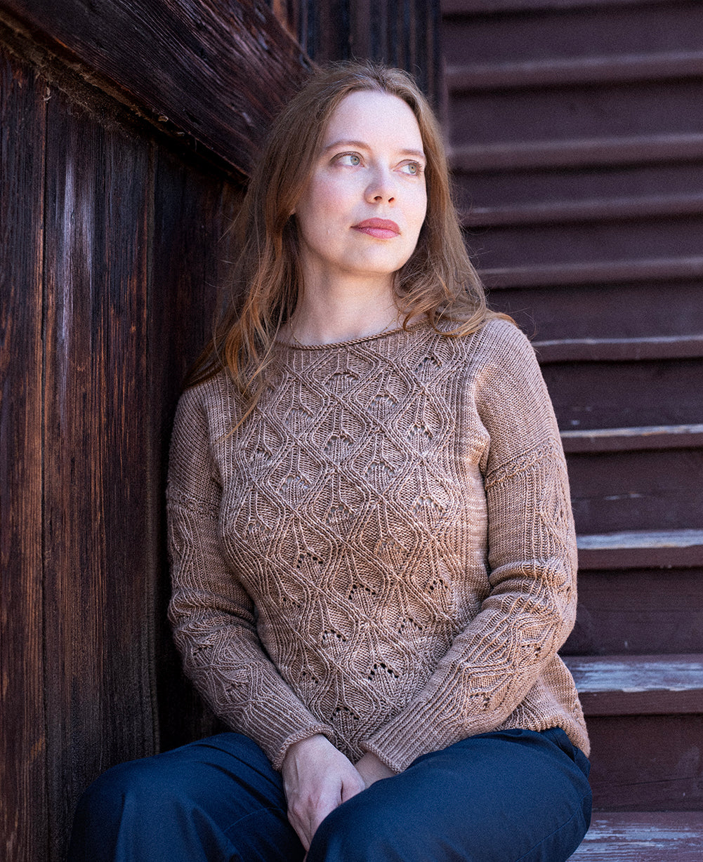 The Apato Pullover is a modern top-down sweater that blends clean stockinette fabric with striking twisted stitch cable panels. The design features bold vertical motifs on the front, back and sleeves, framed by simple lines that keep the look balanced and wearable. Worked seamlessly from the neckline down, Apato allows easy customization of body and sleeve length while maintaining a polished finish. With its flowing cables and versatile silhouette, this pullover is both engaging to knit and effortless to wear.