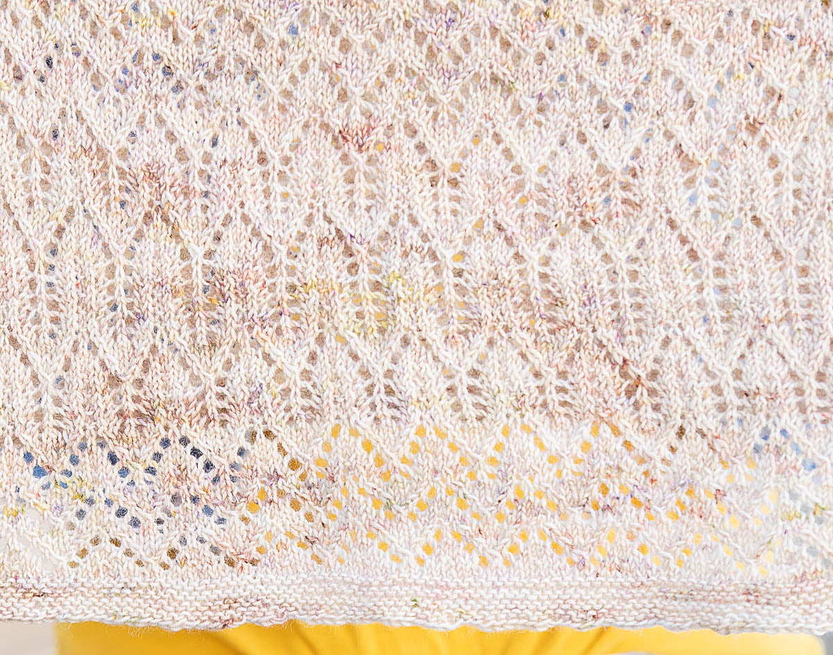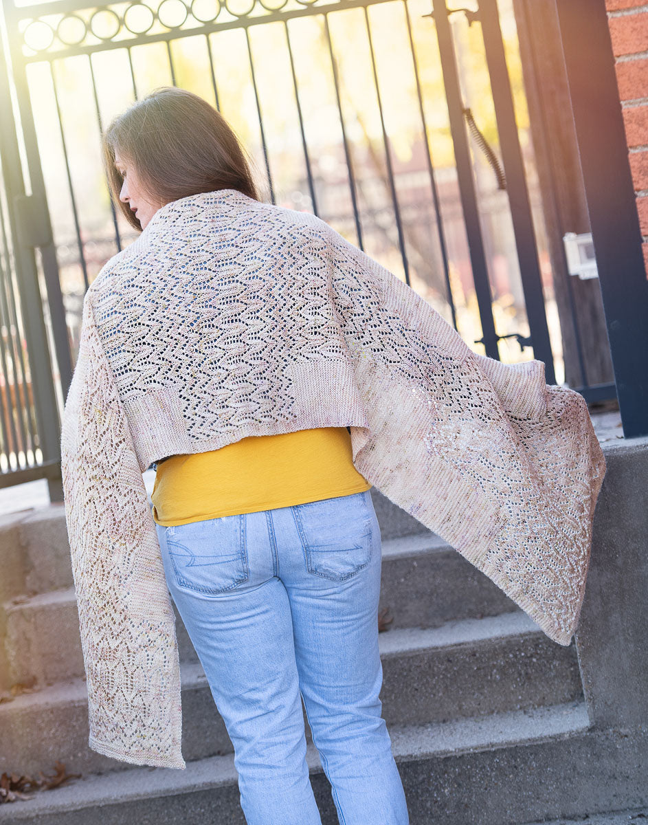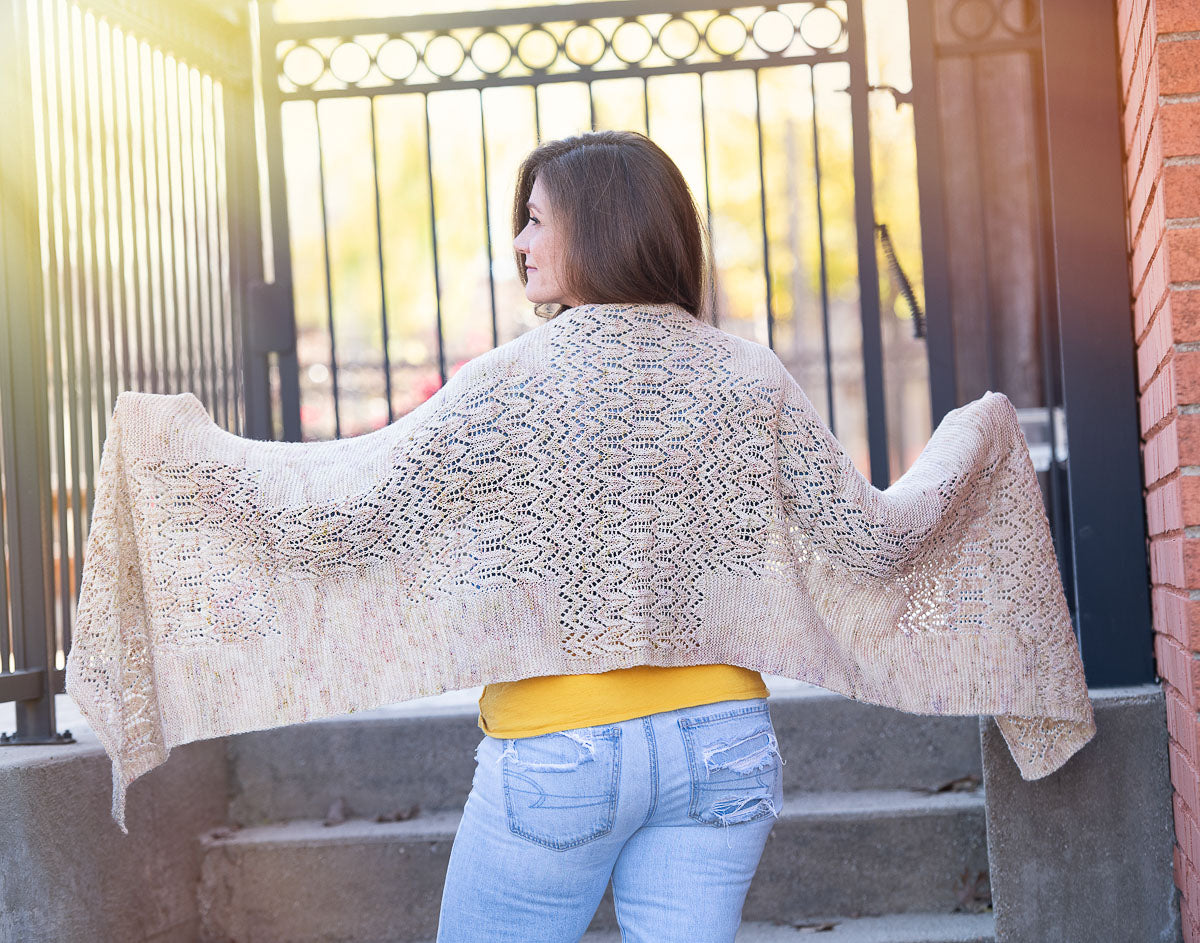 Arrowsmith is an exploration of simple geometric forms within a defined space. This large rectangular wrap is knit in one piece from one end to the other. The lacy arrowhead motifs grow taller and shorter as you knit, and shift in and out over the length of the wrap for more interest.