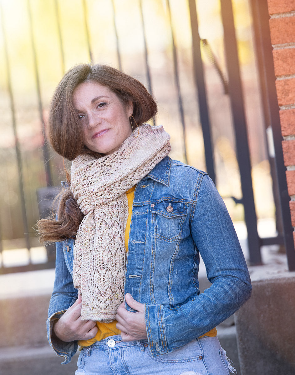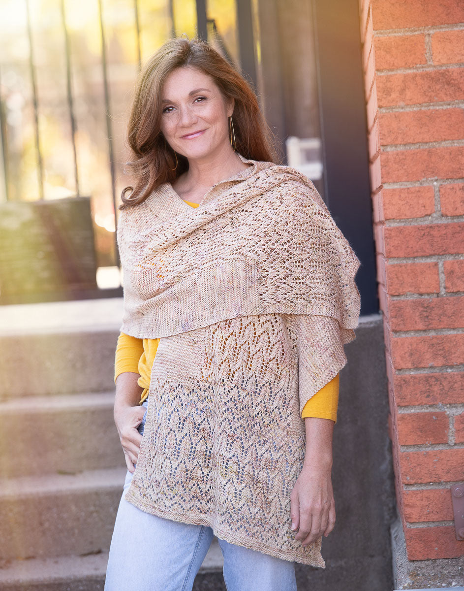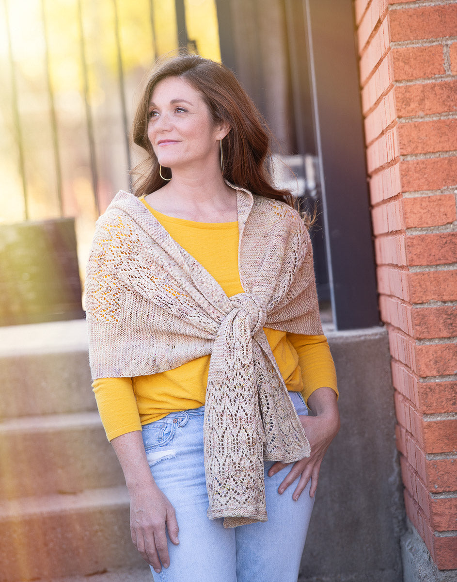 Arrowsmith is an exploration of simple geometric forms within a defined space. This large rectangular wrap is knit in one piece from one end to the other. The lacy arrowhead motifs grow taller and shorter as you knit, and shift in and out over the length of the wrap for more interest.