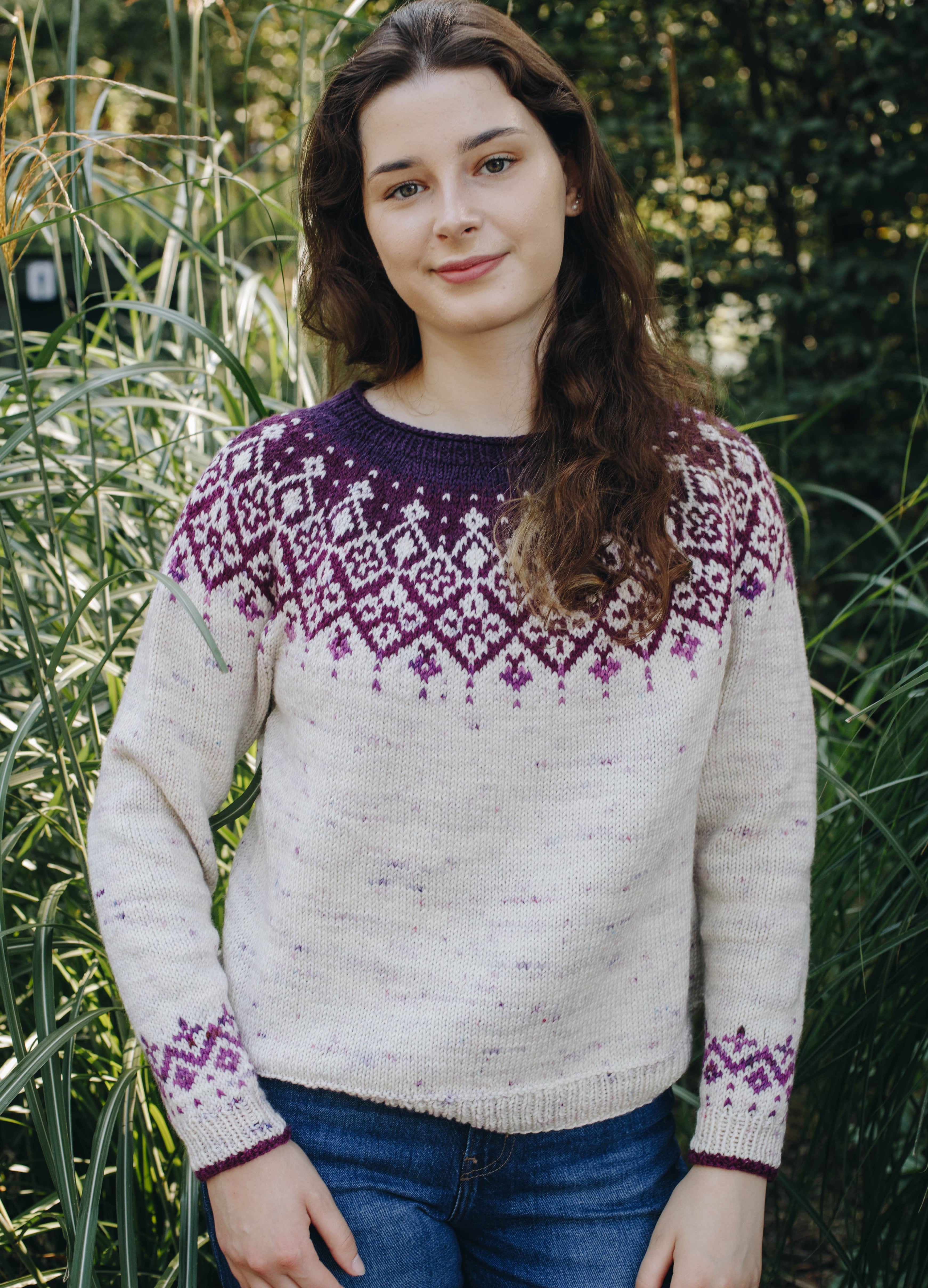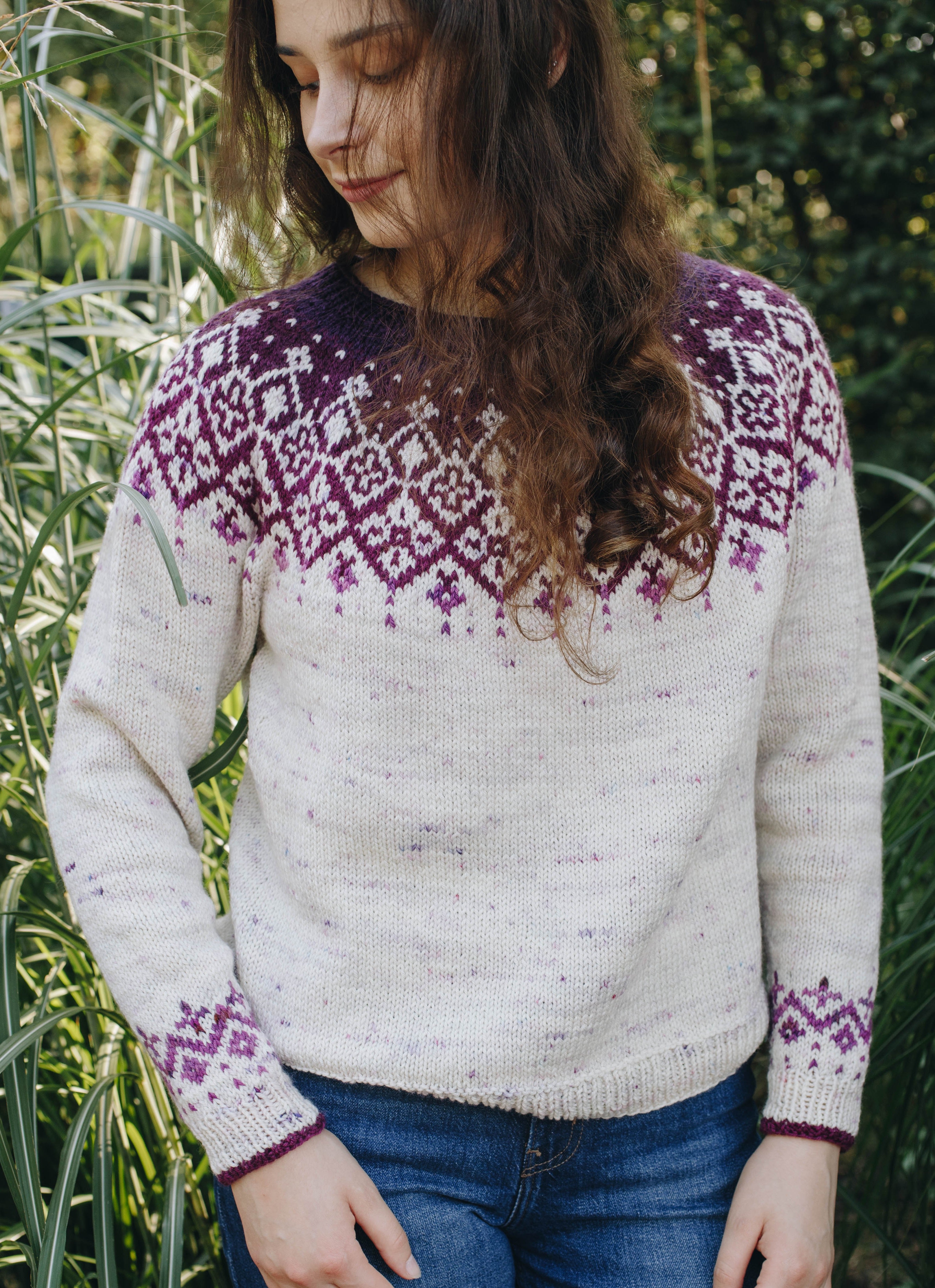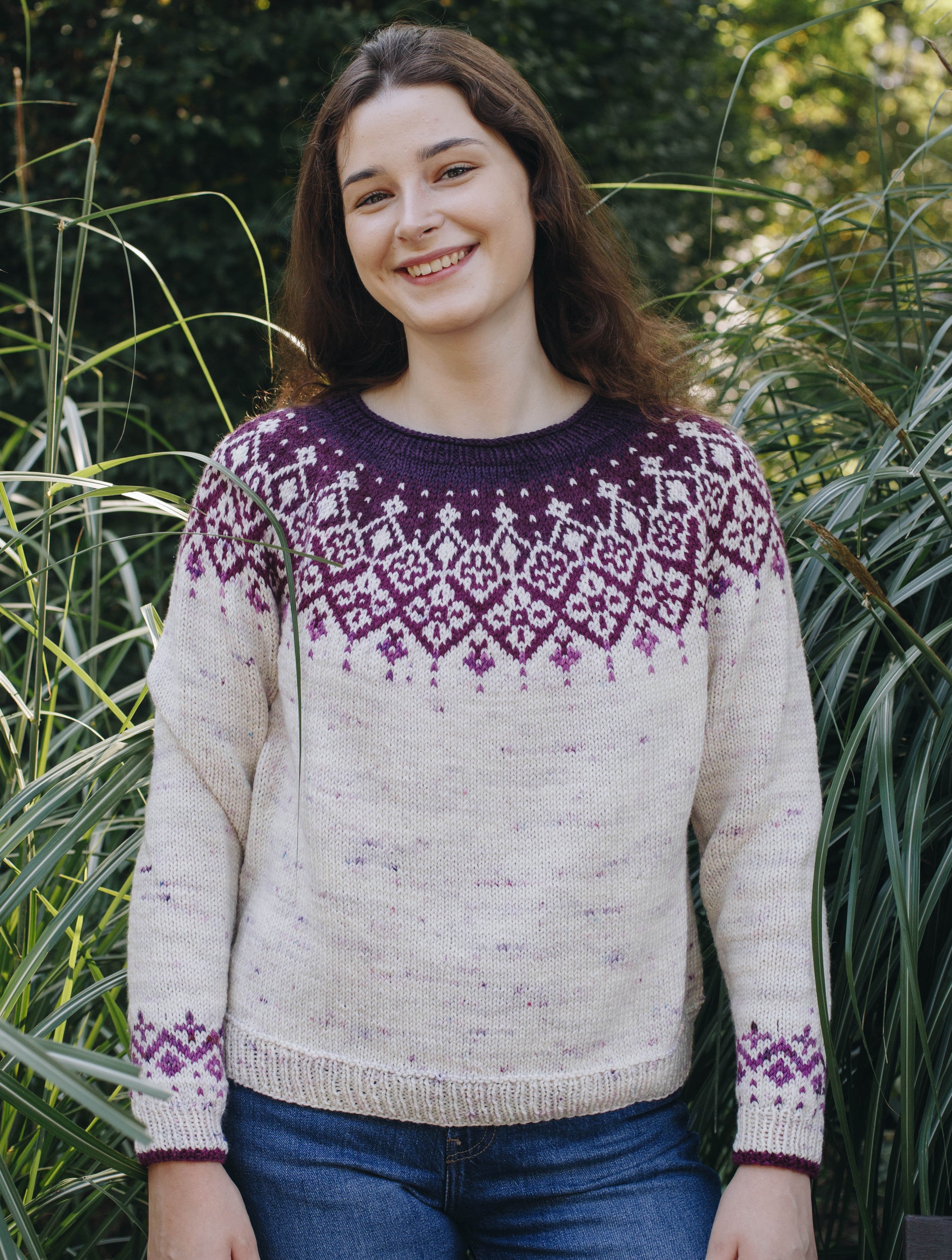 This sweater is shown here in Yowza in Posey with Sagrada, Wolfsbane, Bougainvillea, and Opulent in Yowza Mini.