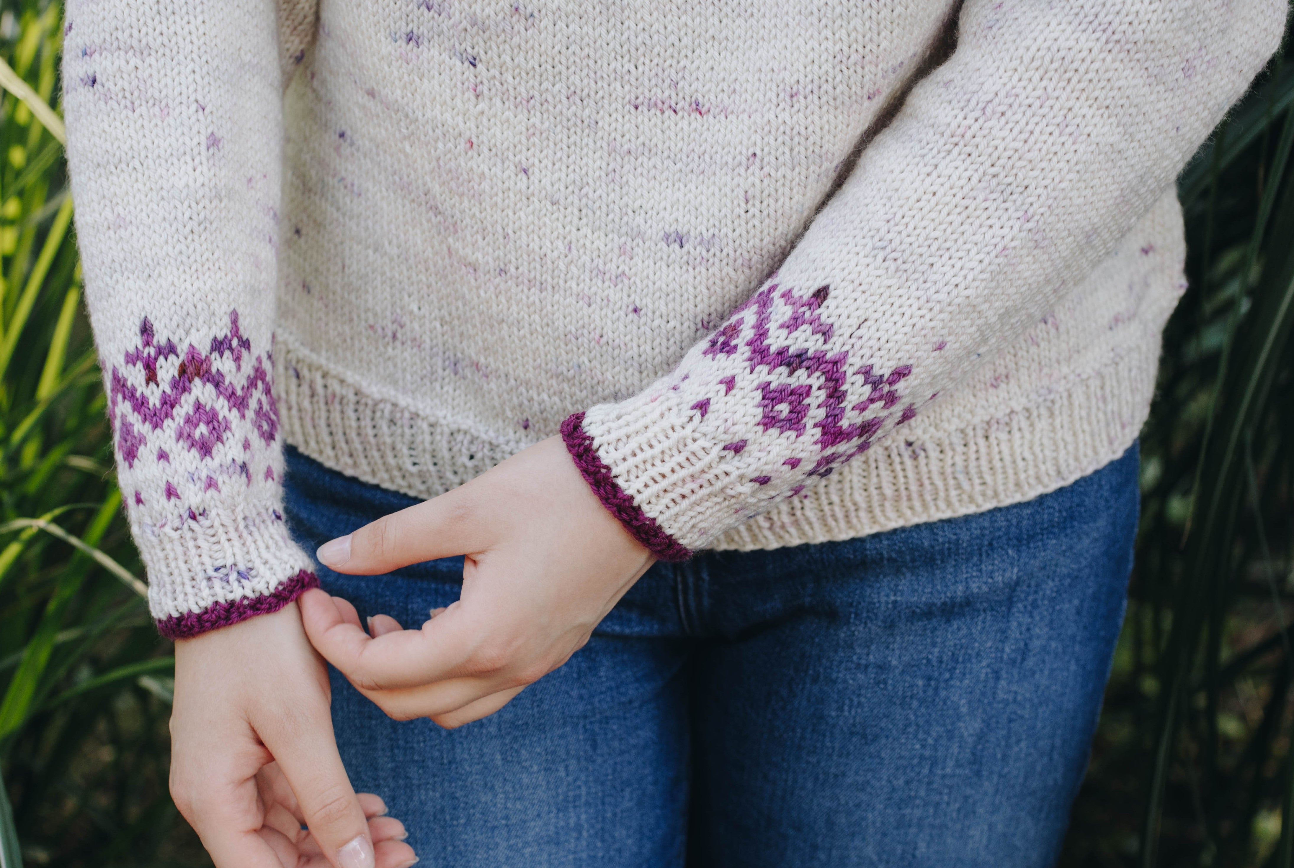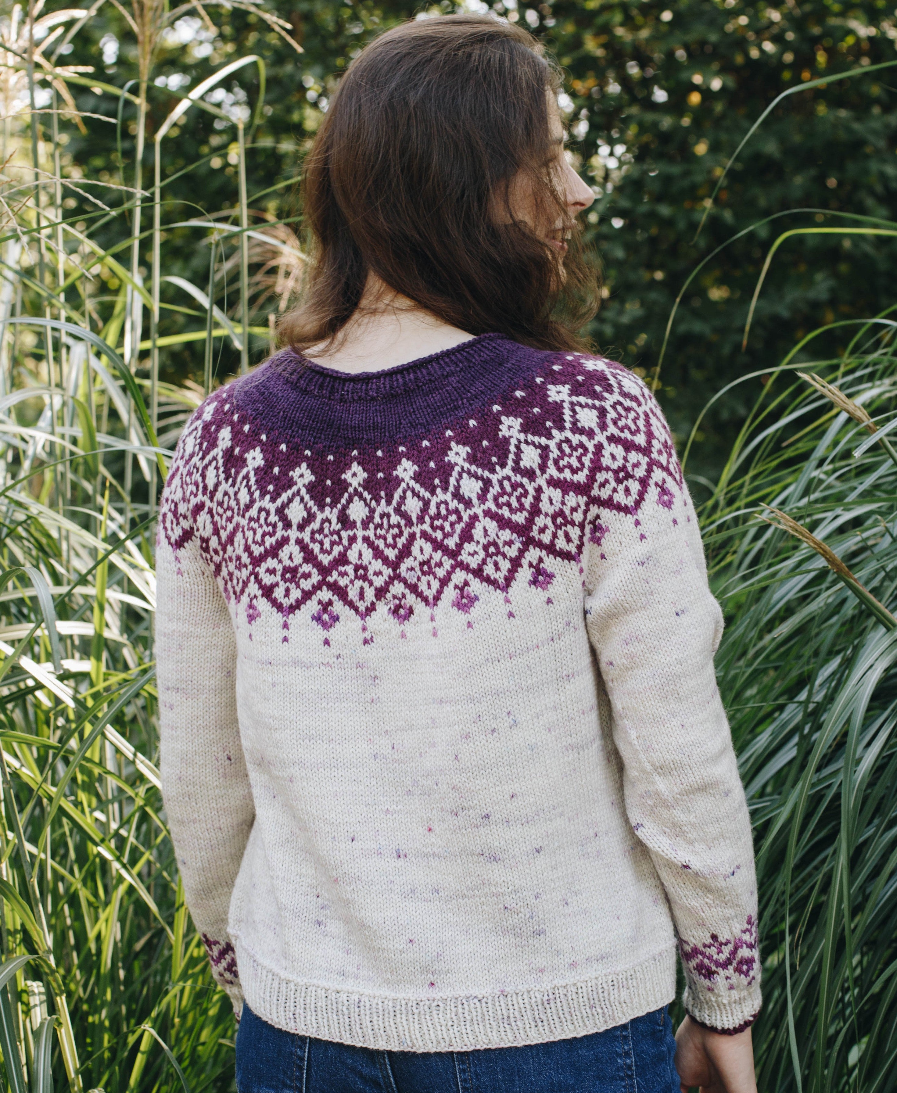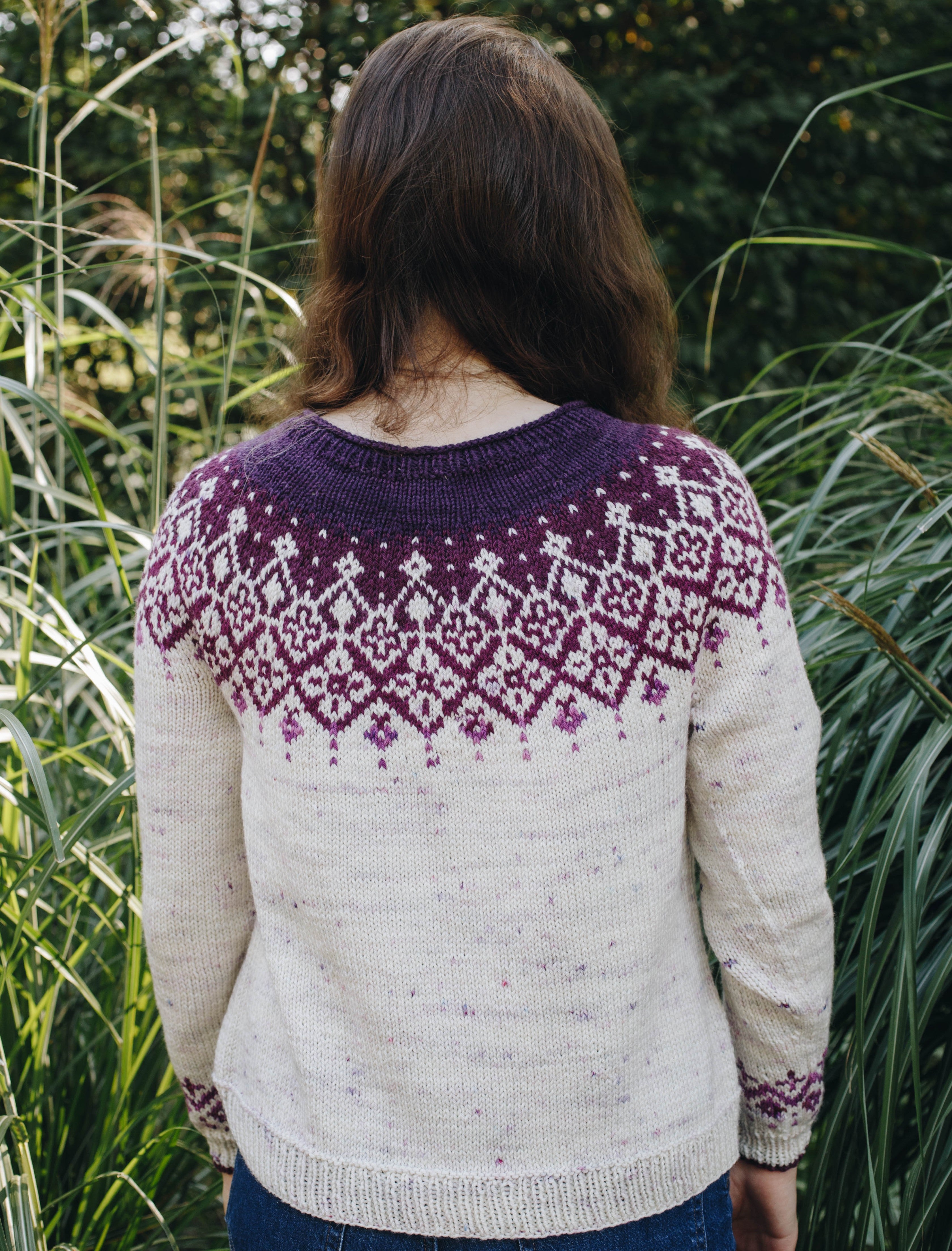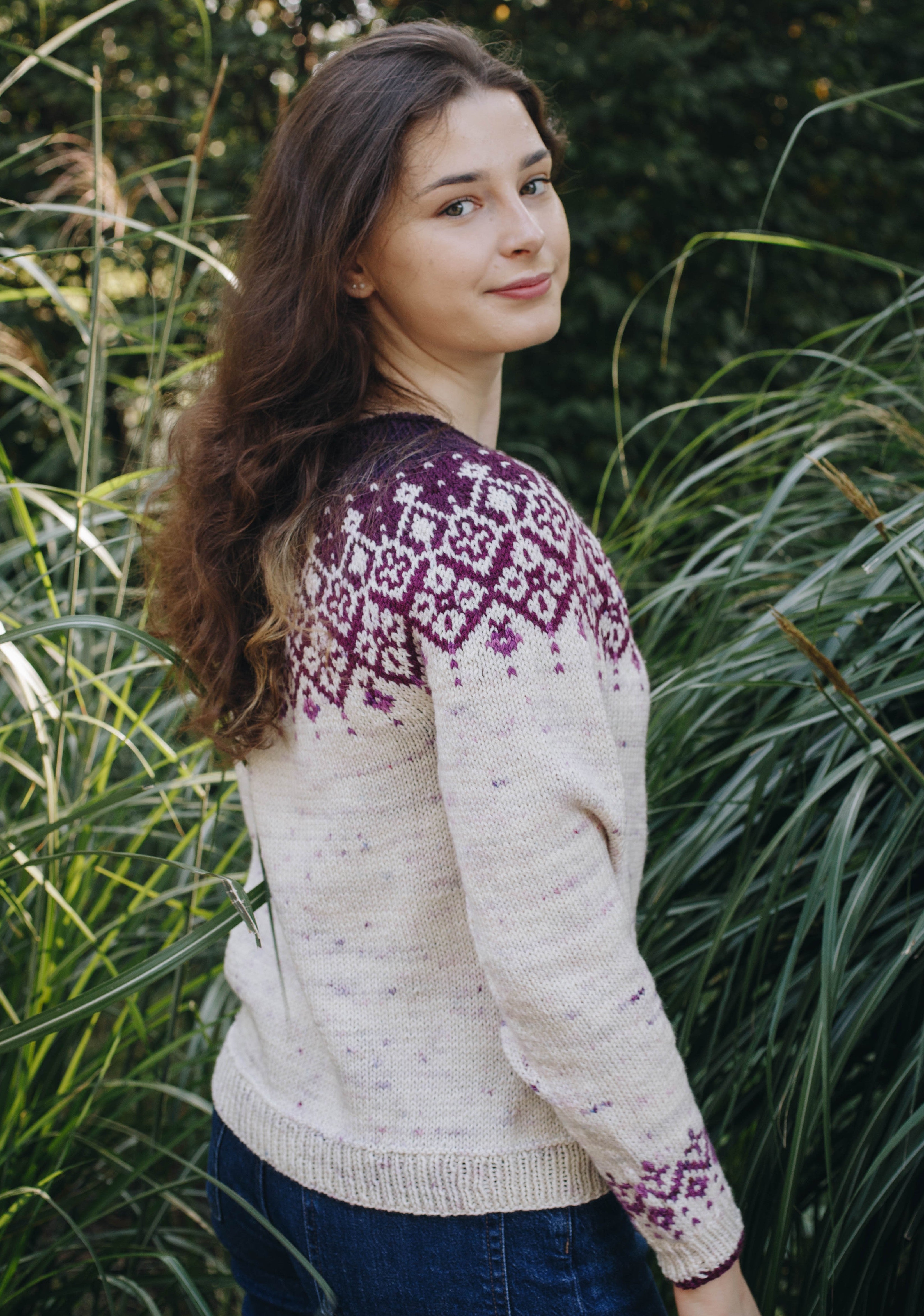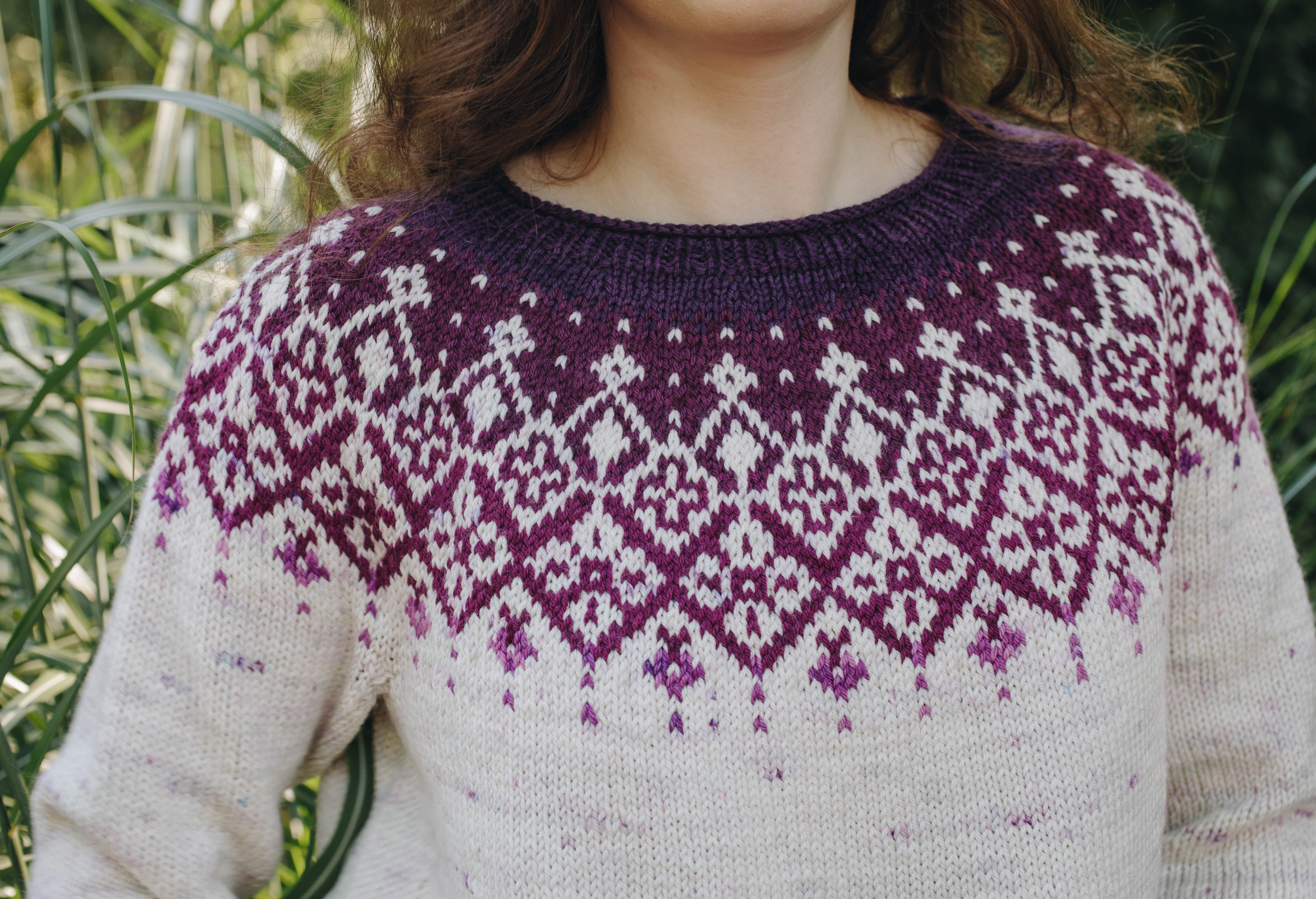 Asara is a top-down seamless yoke sweater that is knit in the round. There is a ribbed neckline followed by short rows at the back of the neck for a comfortable fit. The yoke features stranded colourwork that inverts in colour. There is optional waist and hip shaping to add feminine shape, and the hem is finished off with ribbing. The sleeves are finished off with stranded colourwork that highlight the yoke motif and ribbing. Asara was inspired by Polish embroidery from the Malopolska region.