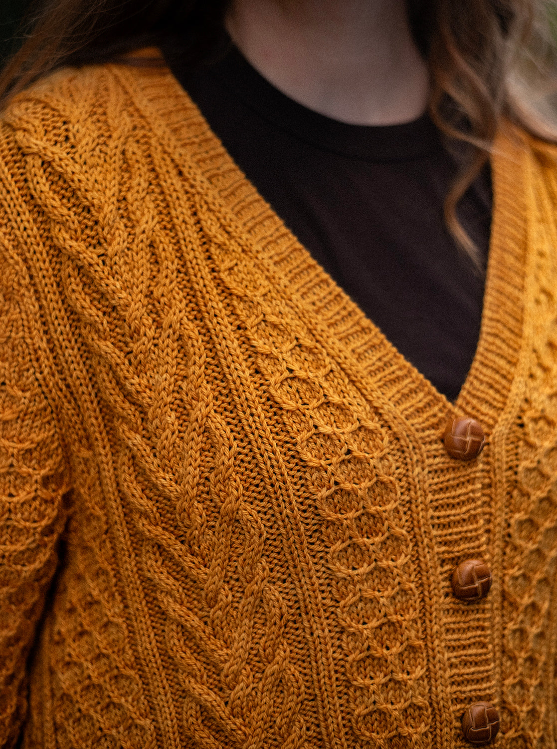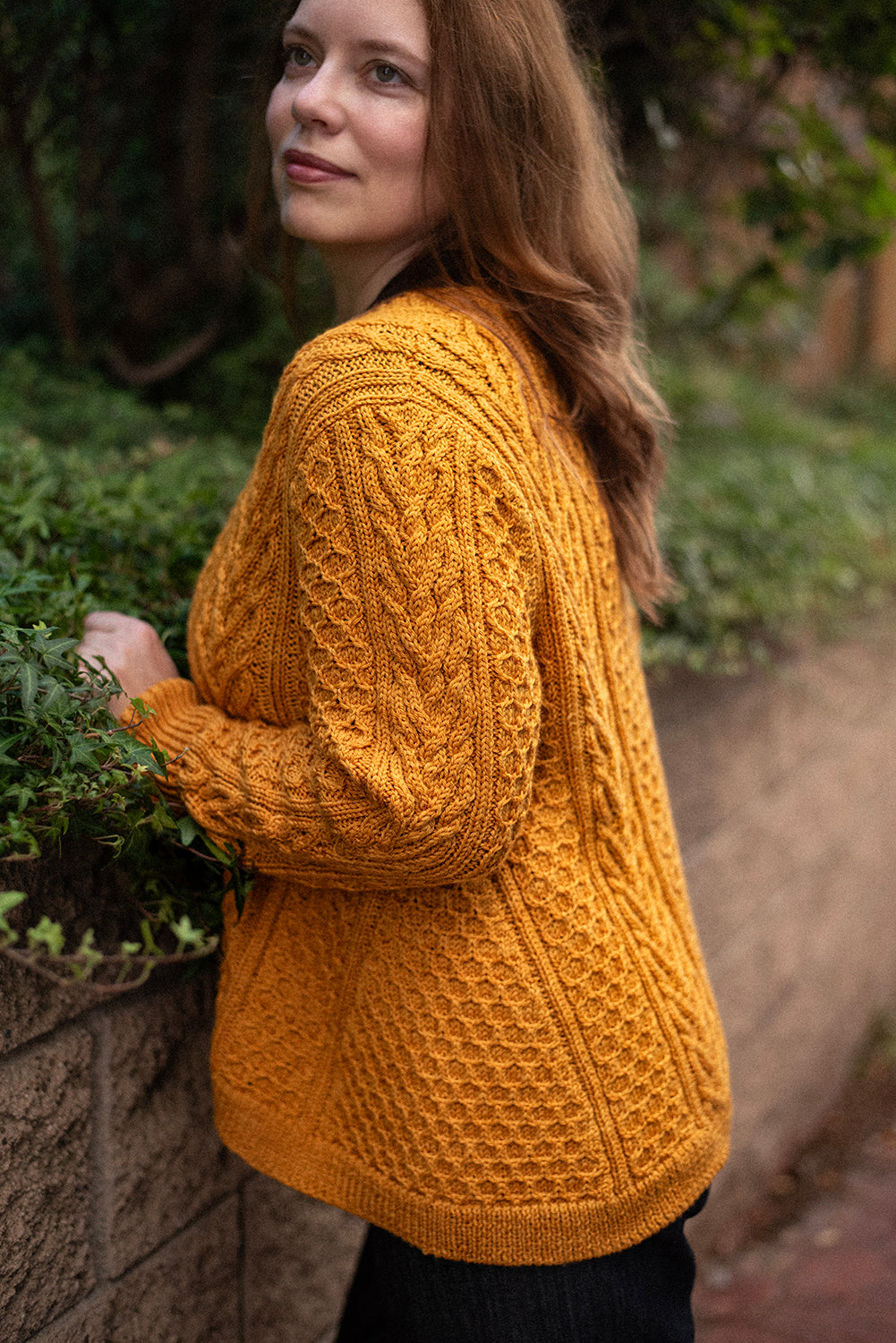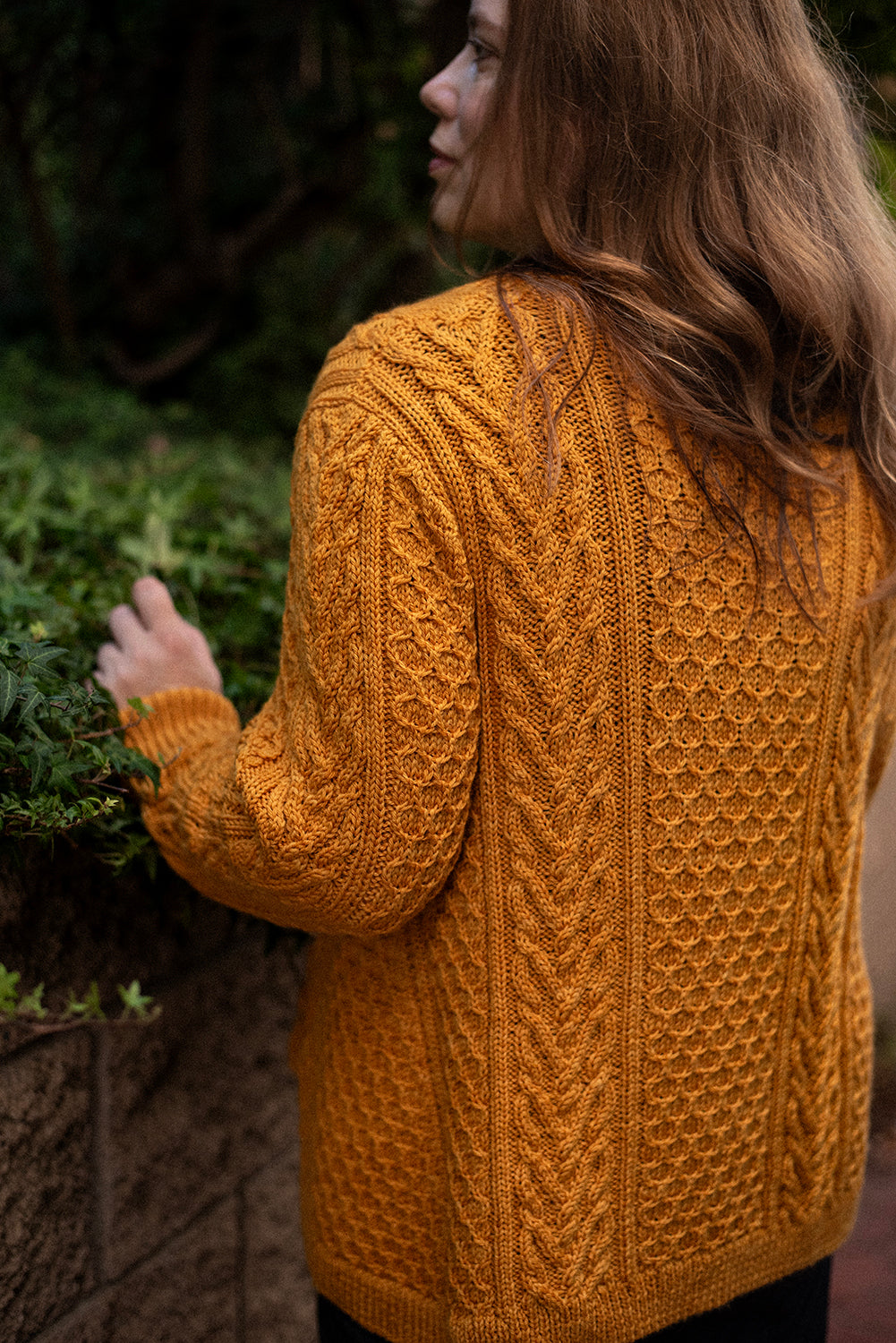Richly textured cables and honeycomb stitches cover this cozy cardigan, creating a fabric that feels as intricate as it looks. Vertical cable panels frame repeating honeycomb motifs, while shaped wedges along the sides add subtle flare and ease to the silhouette. The result is a cardigan with both structure and movement, balancing texture and form. Worked flat with a classic button band, deep ribbing at the hem and cuffs, and a relaxed fit, this piece layers effortlessly over shirts or dresses. Thoughtful shaping ensures a flattering line, while the bold stitchwork makes the cardigan a true showcase of cable artistry.