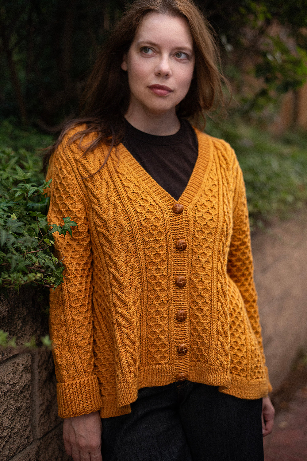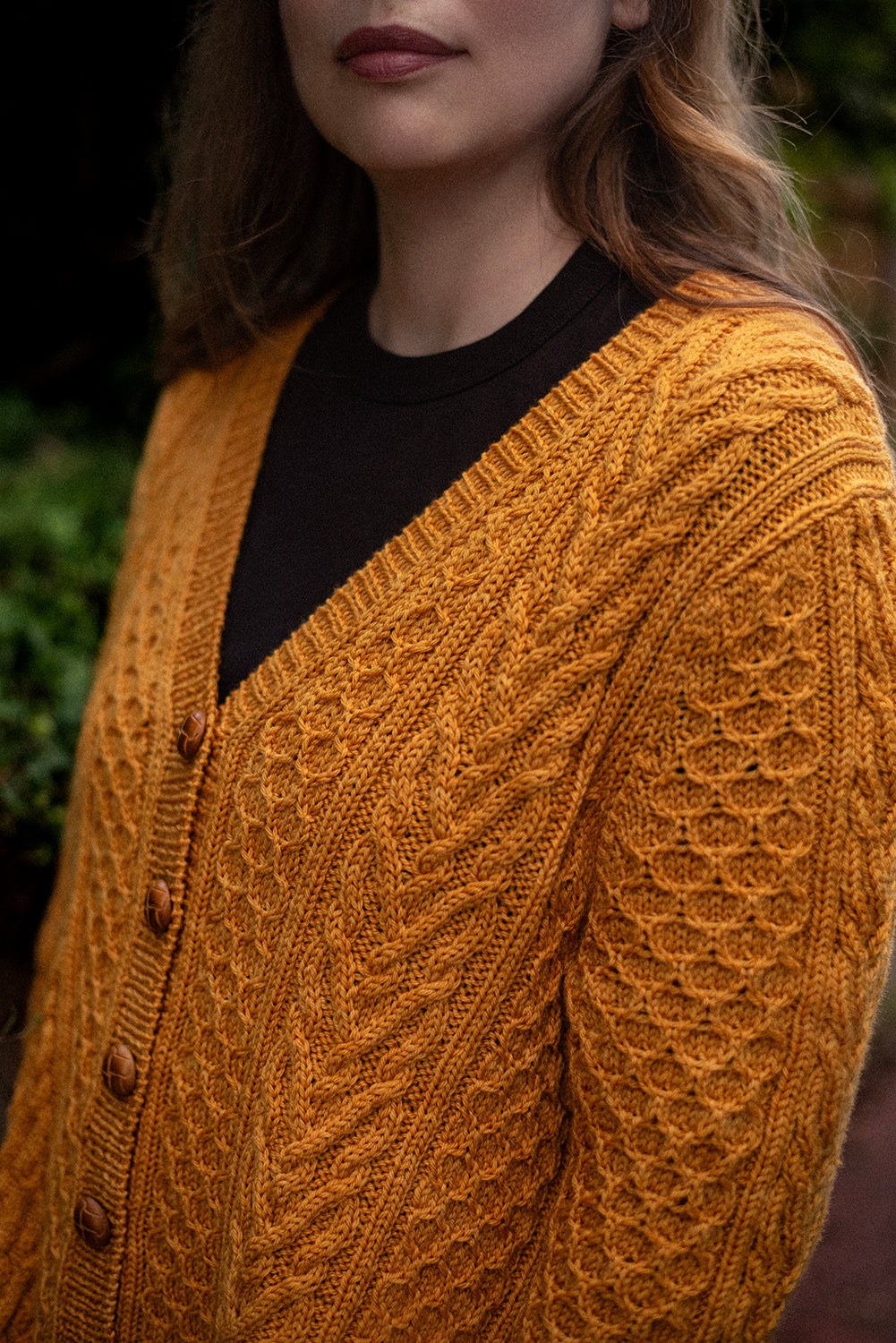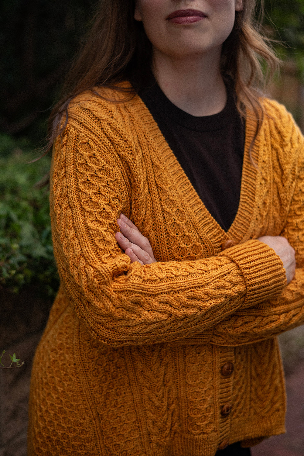 Richly textured cables and honeycomb stitches cover this cozy cardigan, creating a fabric that feels as intricate as it looks. Vertical cable panels frame repeating honeycomb motifs, while shaped wedges along the sides add subtle flare and ease to the silhouette. The result is a cardigan with both structure and movement, balancing texture and form. Worked flat with a classic button band, deep ribbing at the hem and cuffs, and a relaxed fit, this piece layers effortlessly over shirts or dresses. Thoughtful shaping ensures a flattering line, while the bold stitchwork makes the cardigan a true showcase of cable artistry.