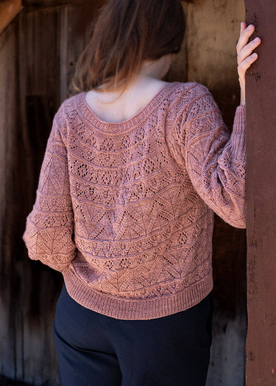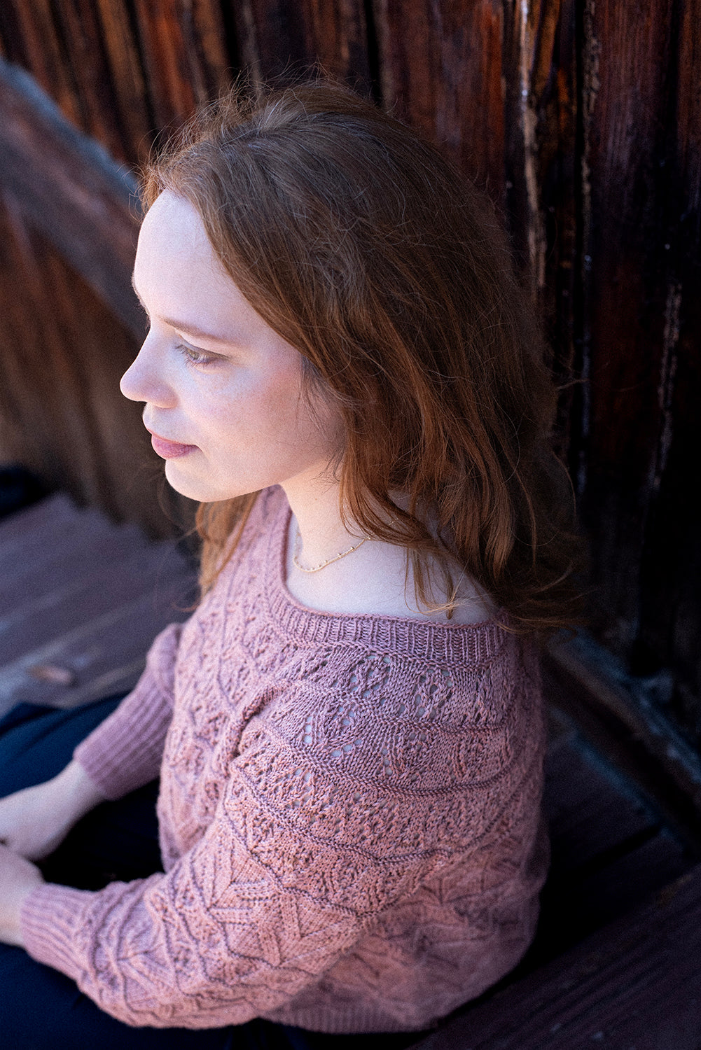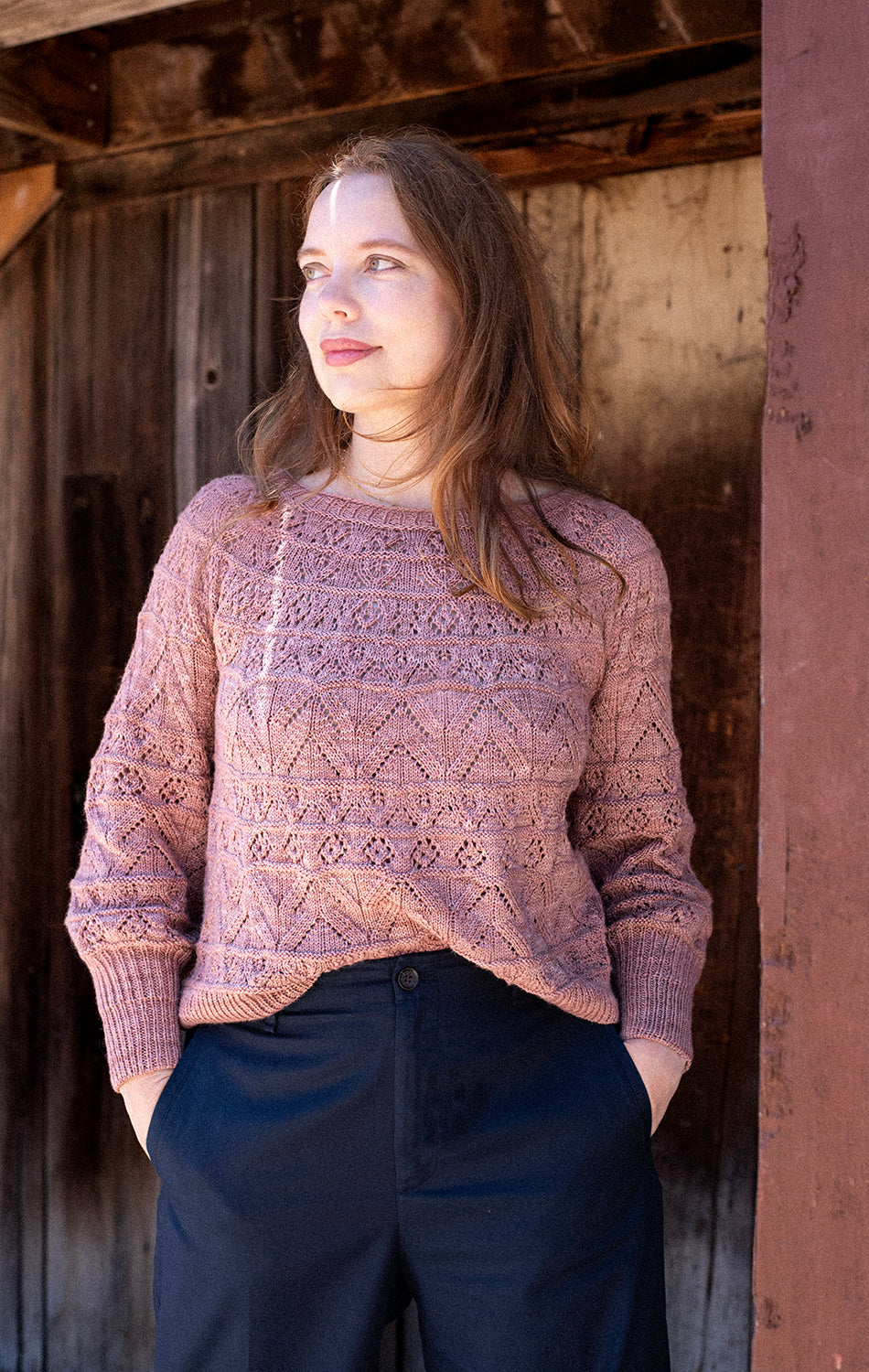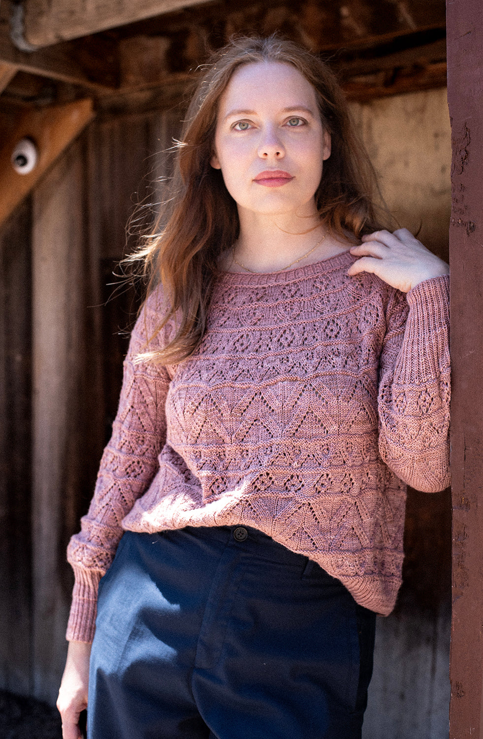 This pullover is a celebration of texture and geometry, worked in an allover lace and knit-purl motif that creates a richly sculpted fabric. Horizontal bands of chevrons, diamonds, and eyelets alternate to form a rhythm of patterning that feels both modern and timeless. The silhouette of this top-down pullover is relaxed yet refined, with a round yoke, straight body, and slightly tapered sleeves finished with deep ribbed cuffs. A simple ribbed hem and neckline provide clean framing that balances the ornate fabric.