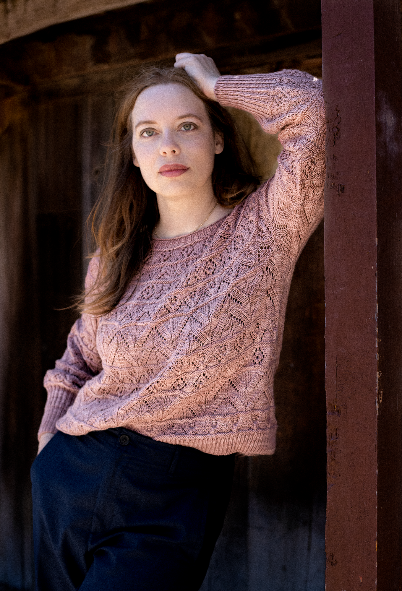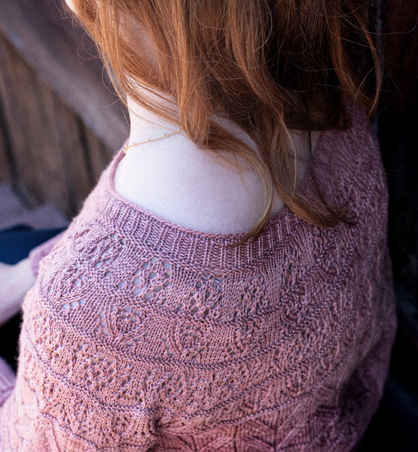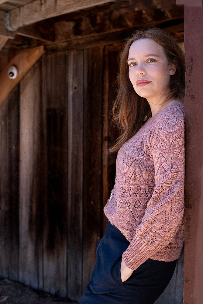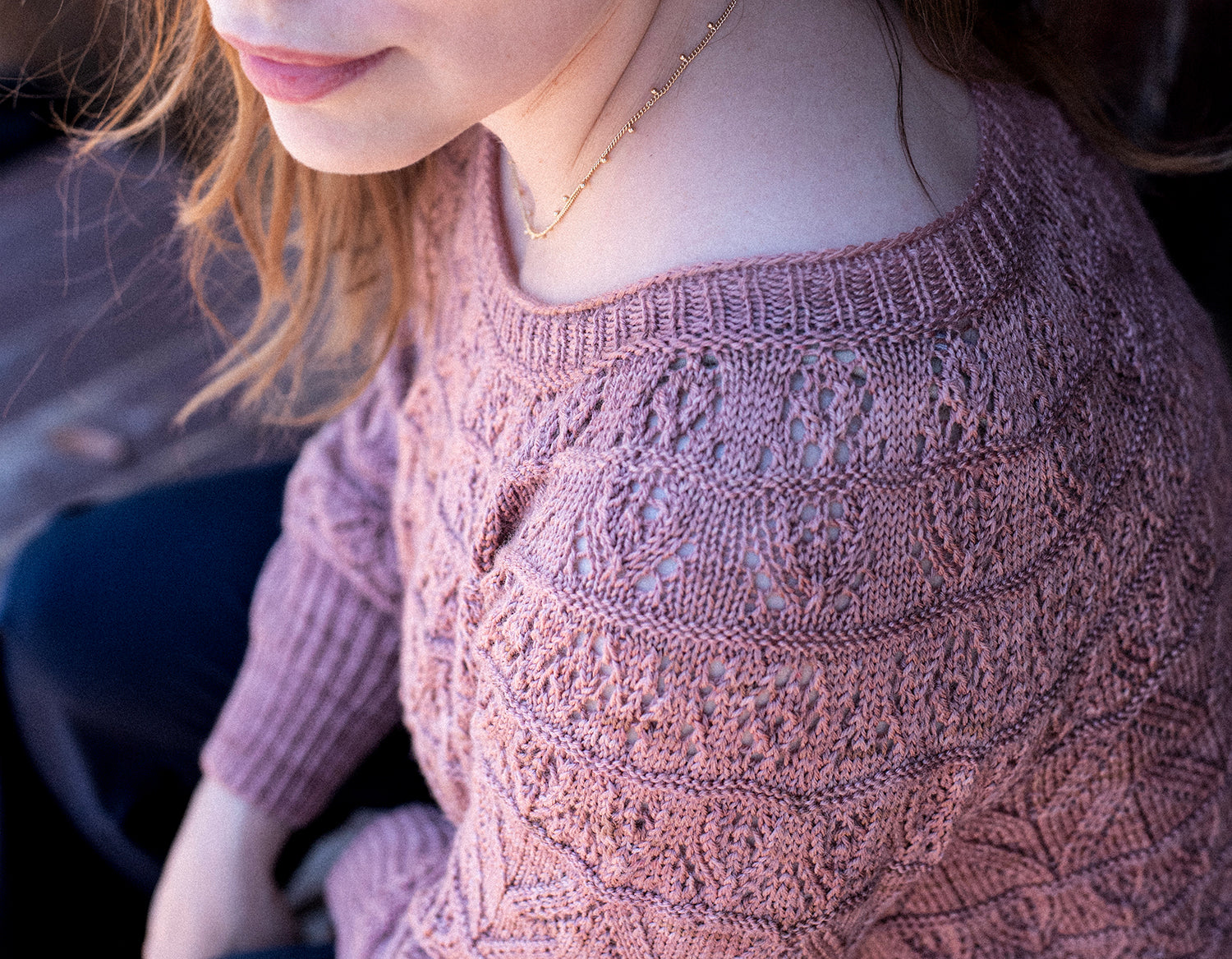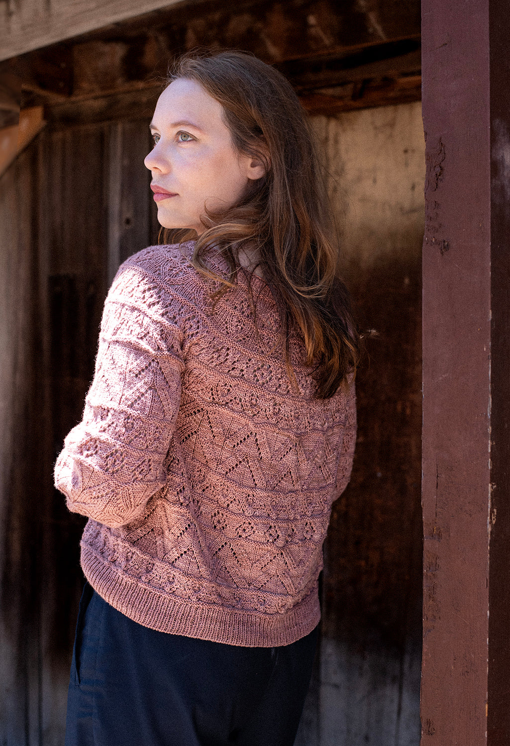This pullover is a celebration of texture and geometry, worked in an allover lace and knit-purl motif that creates a richly sculpted fabric. Horizontal bands of chevrons, diamonds, and eyelets alternate to form a rhythm of patterning that feels both modern and timeless. The silhouette of this top-down pullover is relaxed yet refined, with a round yoke, straight body, and slightly tapered sleeves finished with deep ribbed cuffs. A simple ribbed hem and neckline provide clean framing that balances the ornate fabric.