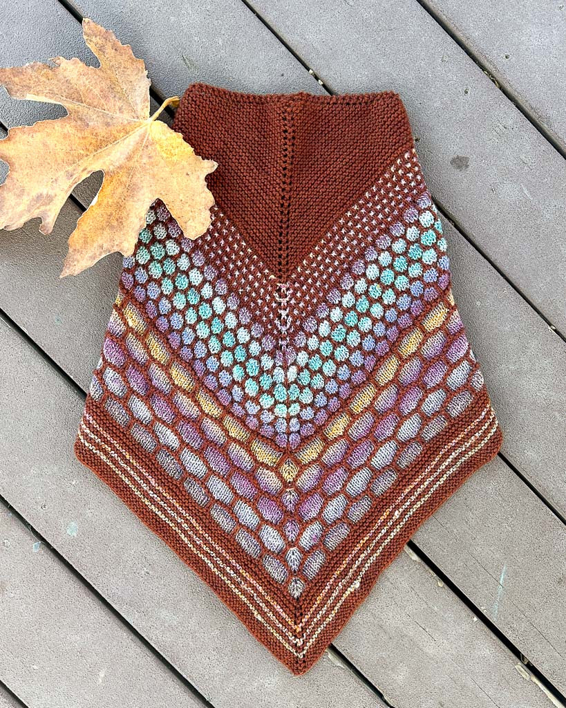 Our sample was knit in Killington in the Russet colorway together with Feederbrook Entropy DK in Theta (discontinued).