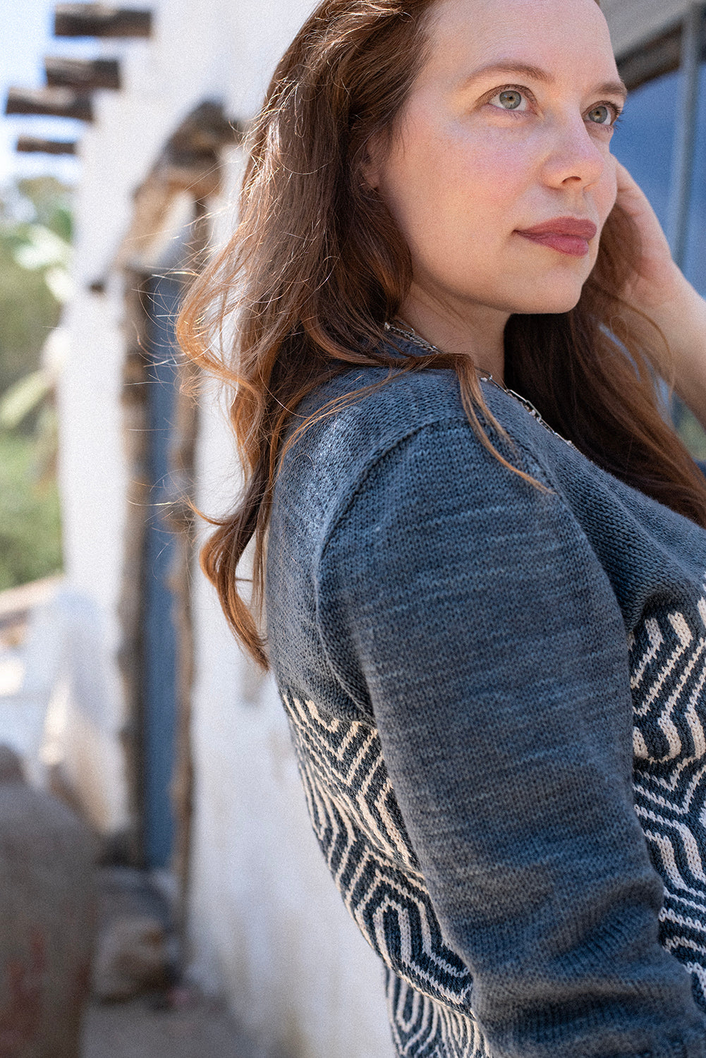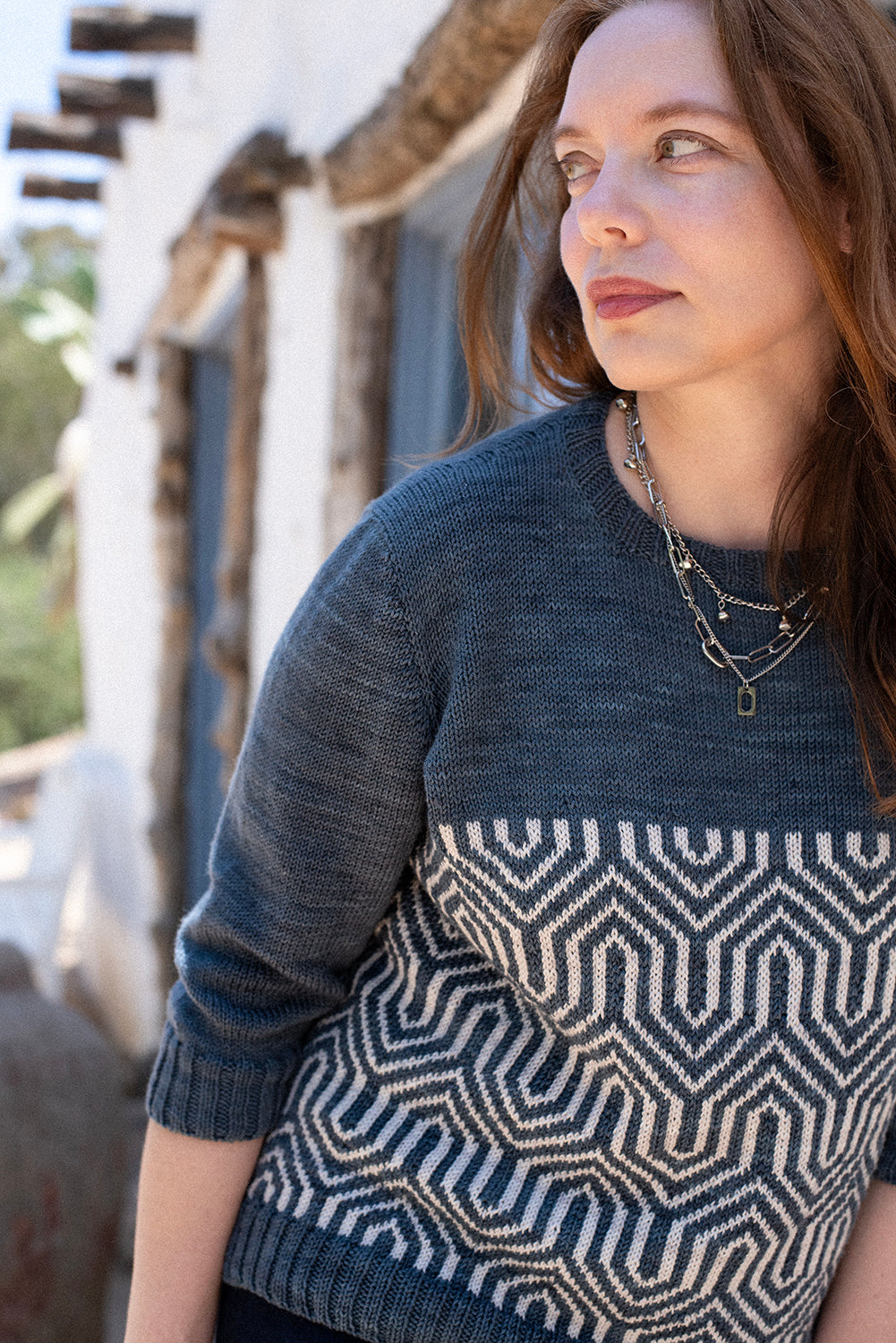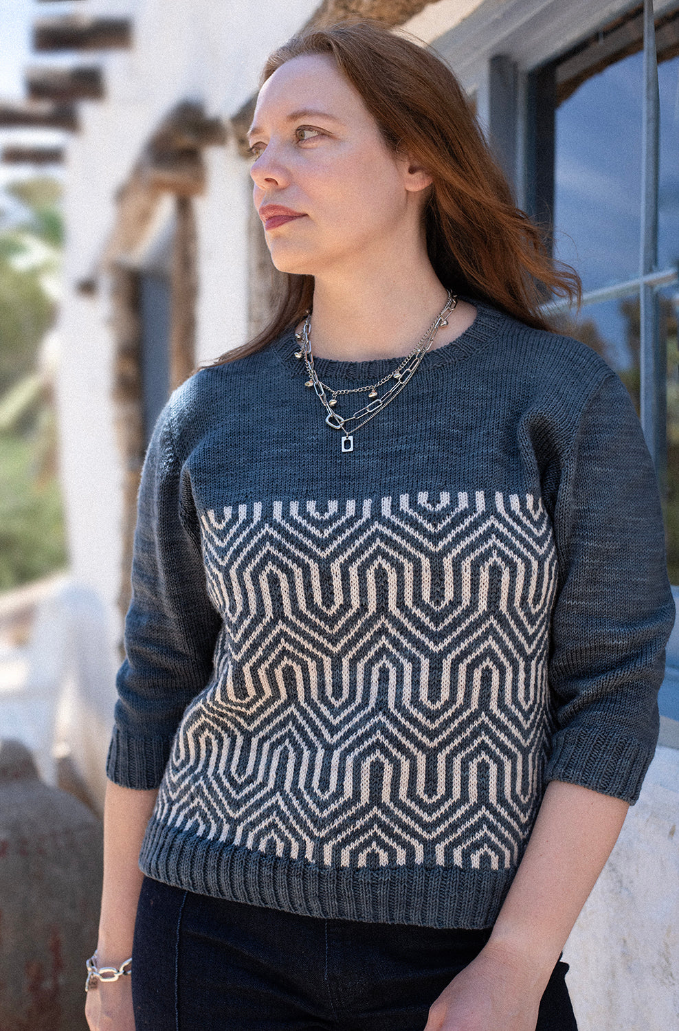 Inspired by the dramatic ridges and sharp contours of Mount Elbrus in the Caucasus, this pullover showcases bold geometric colorwork that echoes the mountain’s angular slopes. The two-tone motif is worked in stranded knitting across the body, with mirrored lines that create depth and movement. Solid stockinette at the yoke, sleeves, and hem provides balance, letting the striking patterning take center stage. The sweater features a straight body and set-in style sleeves for a comfortable fit. Worked seamlessly, the design highlights the rhythm of the charted motif while keeping construction approachable.