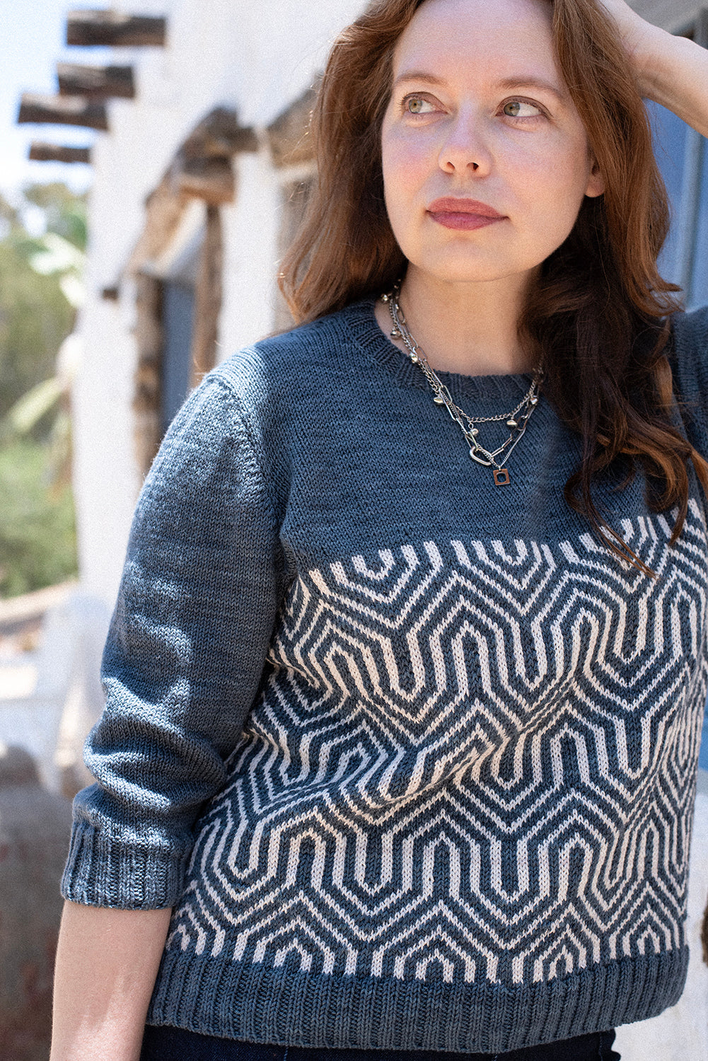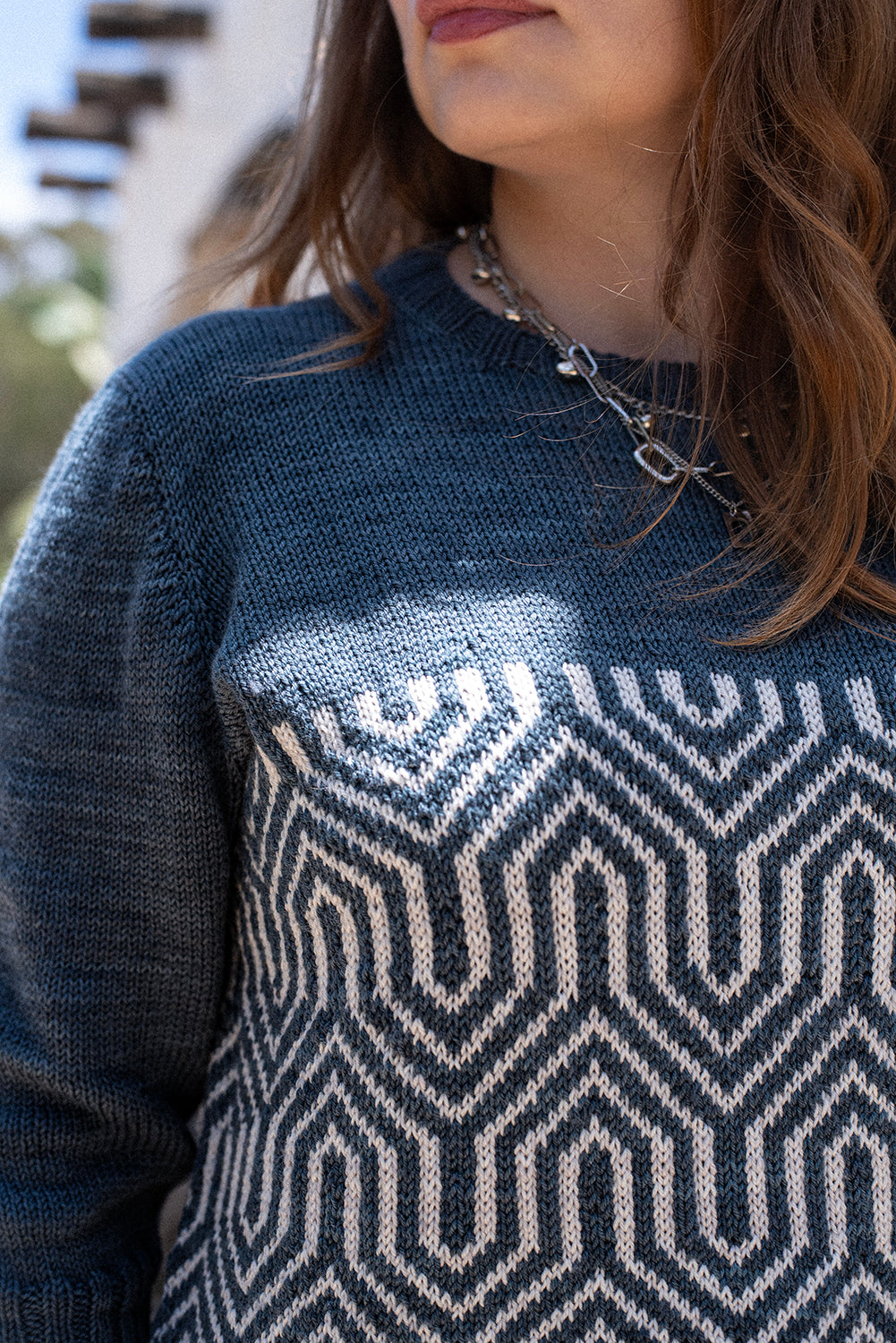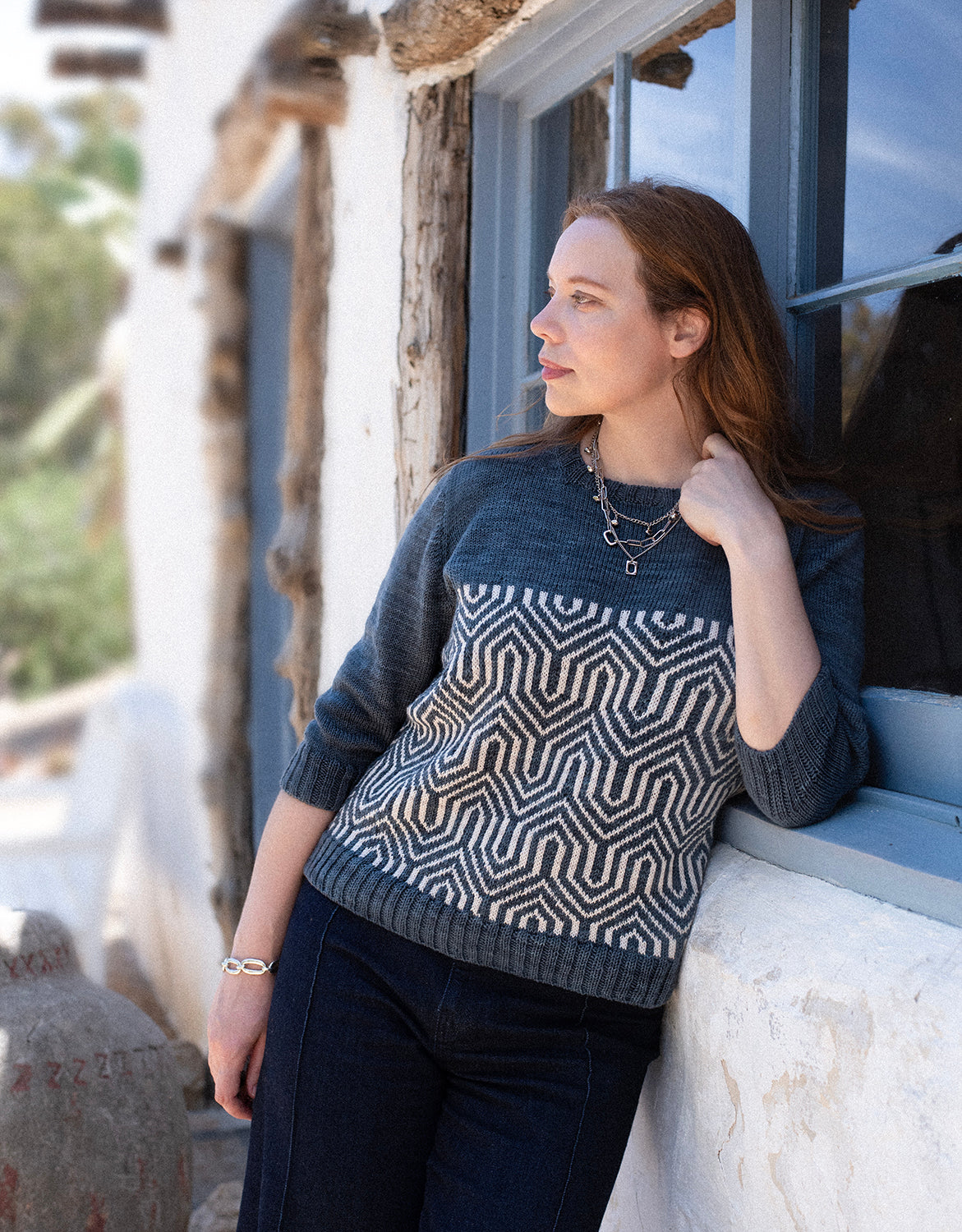 Inspired by the dramatic ridges and sharp contours of Mount Elbrus in the Caucasus, this pullover showcases bold geometric colorwork that echoes the mountain’s angular slopes. The two-tone motif is worked in stranded knitting across the body, with mirrored lines that create depth and movement. Solid stockinette at the yoke, sleeves, and hem provides balance, letting the striking patterning take center stage. The sweater features a straight body and set-in style sleeves for a comfortable fit. Worked seamlessly, the design highlights the rhythm of the charted motif while keeping construction approachable.