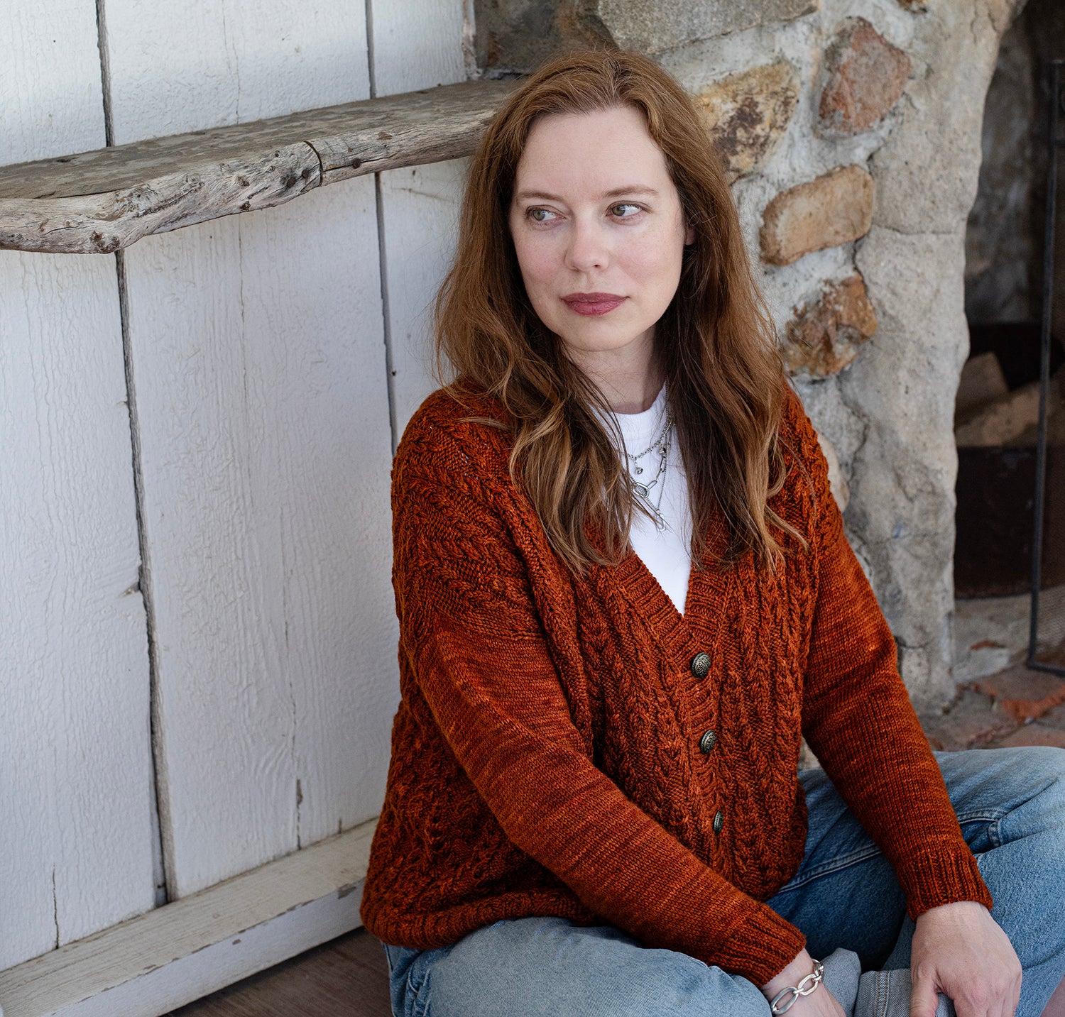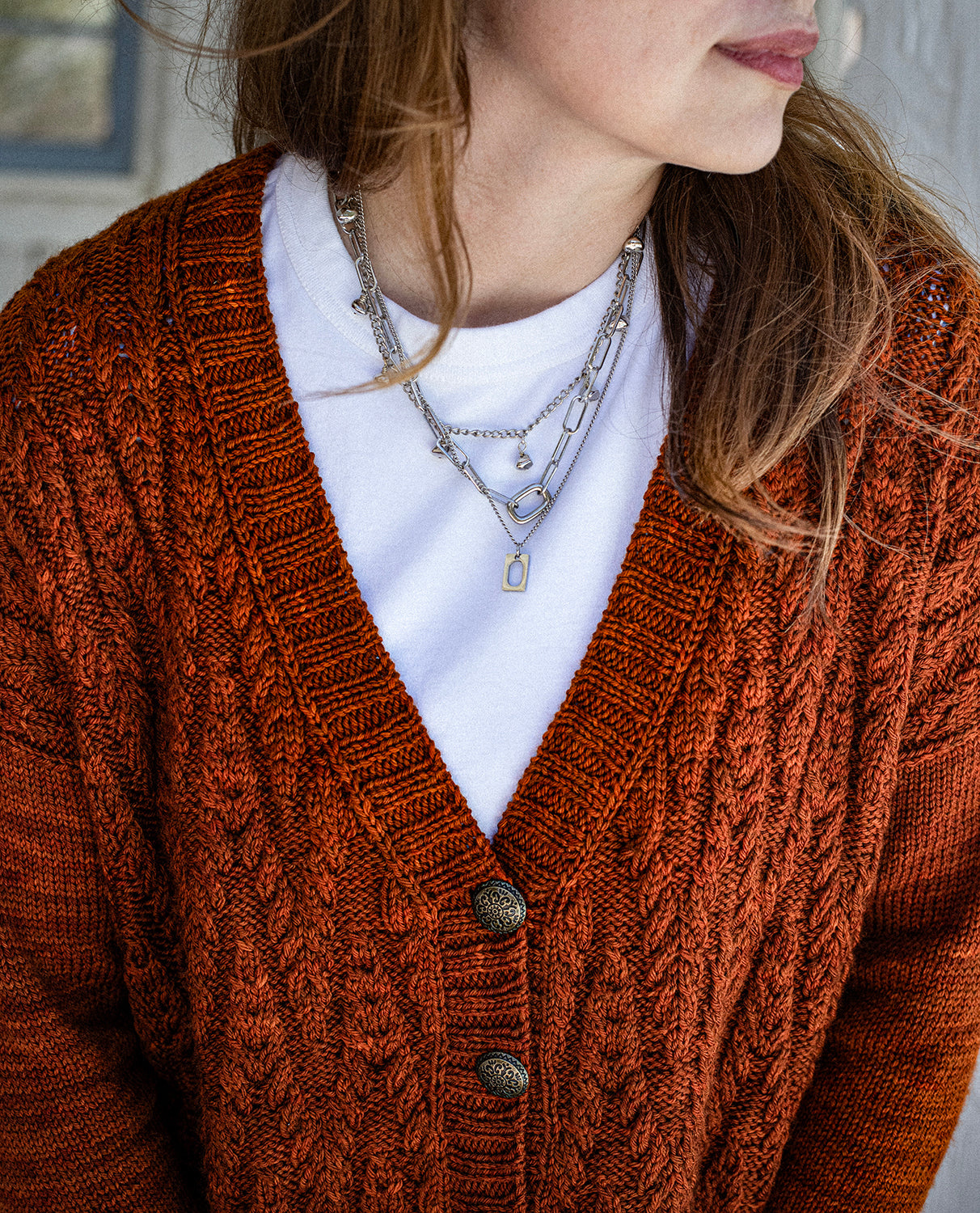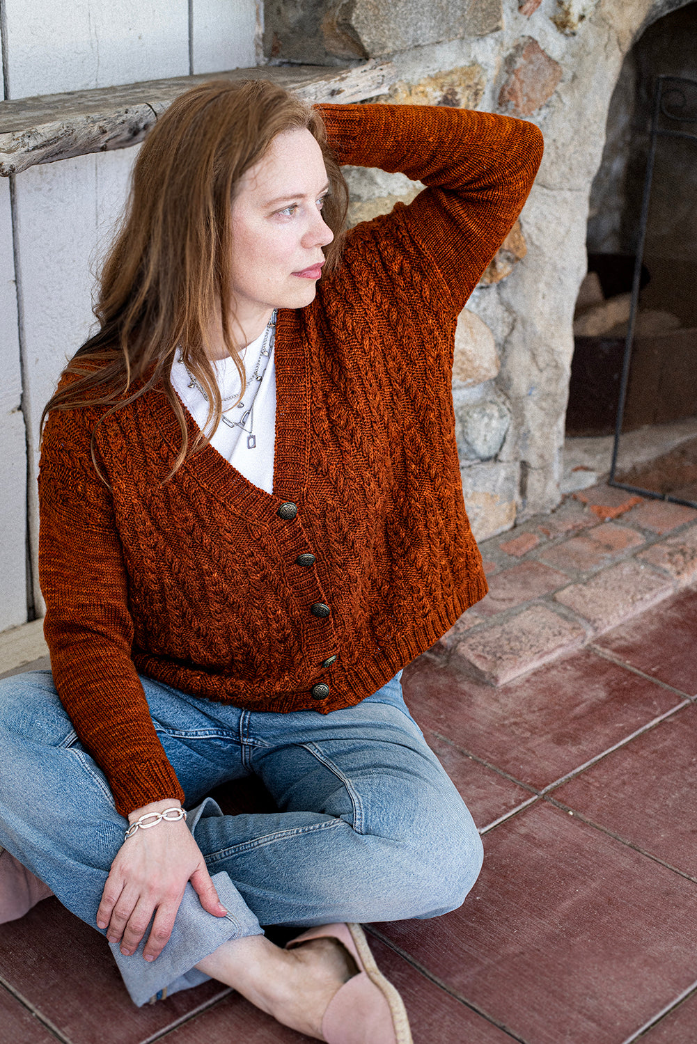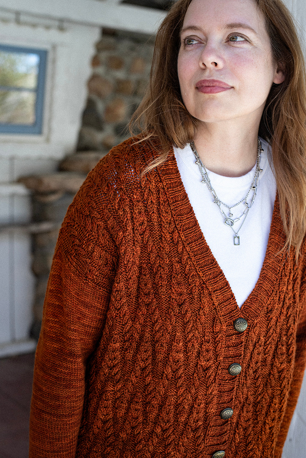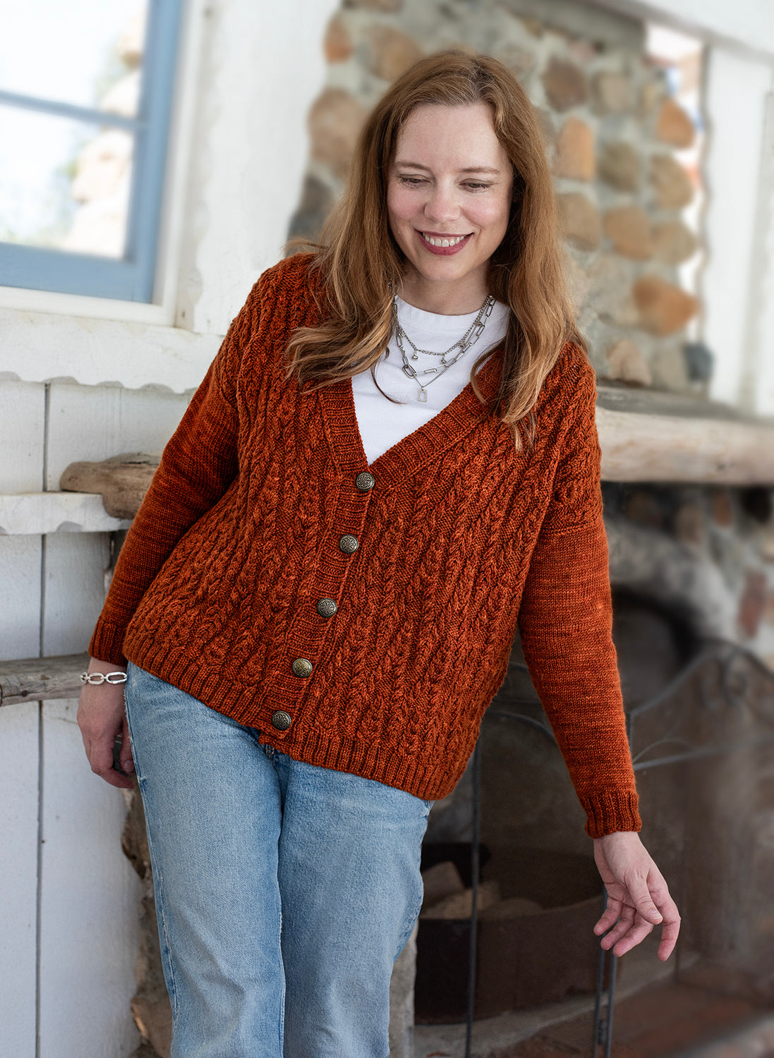 Richly textured cables bring warmth and character to this button-front cardigan. Worked in an engaging allover cable motif, the fabric has depth and dimension while maintaining a comfortable drape. The V-neckline and classic button band frame the design, giving it a versatile style that layers easily over casual or dressier outfits. Stockinette sleeves provide contrast to the heavily patterned body, letting the cablework stand out while ensuring a smooth, easy fit through the arms. Ribbing at the hem, cuffs, and button band ties the design together with a neat finish.