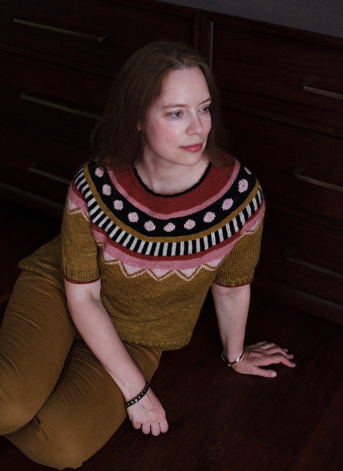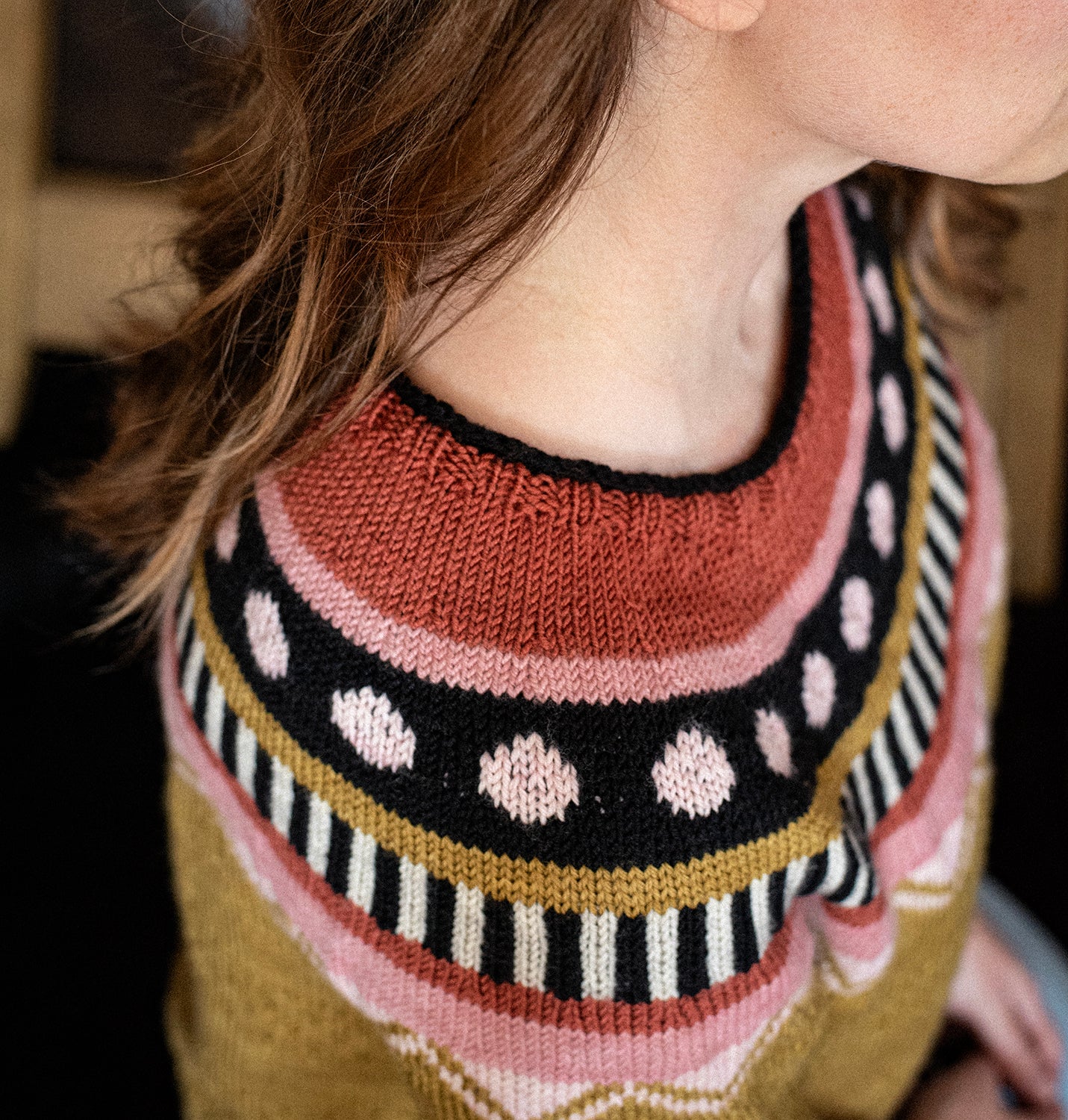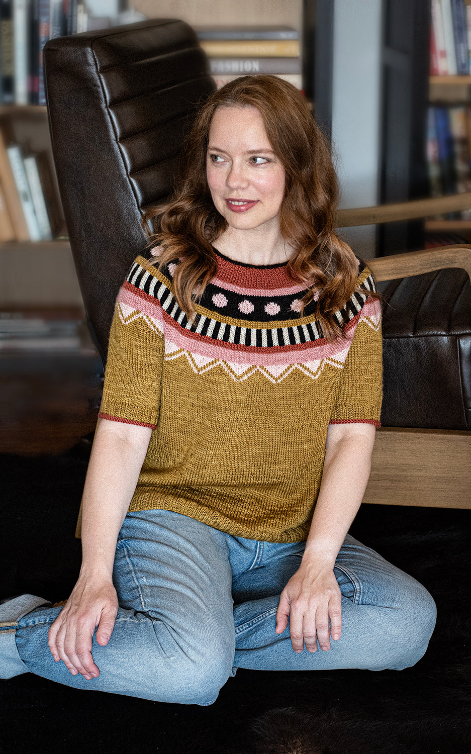 Bold colorwork and playful geometry define this short-sleeved pullover. The round yoke features striking bands of stripes, scallops, and polka-dot motifs that flow together in an eye-catching palette. Below the yoke, the body transitions into smooth stockinette with subtle textured accents, letting the vibrant upper section instantly catch attention.