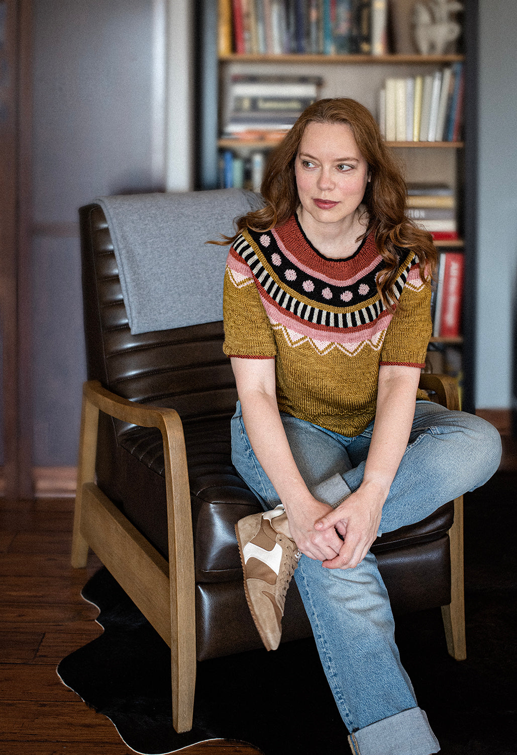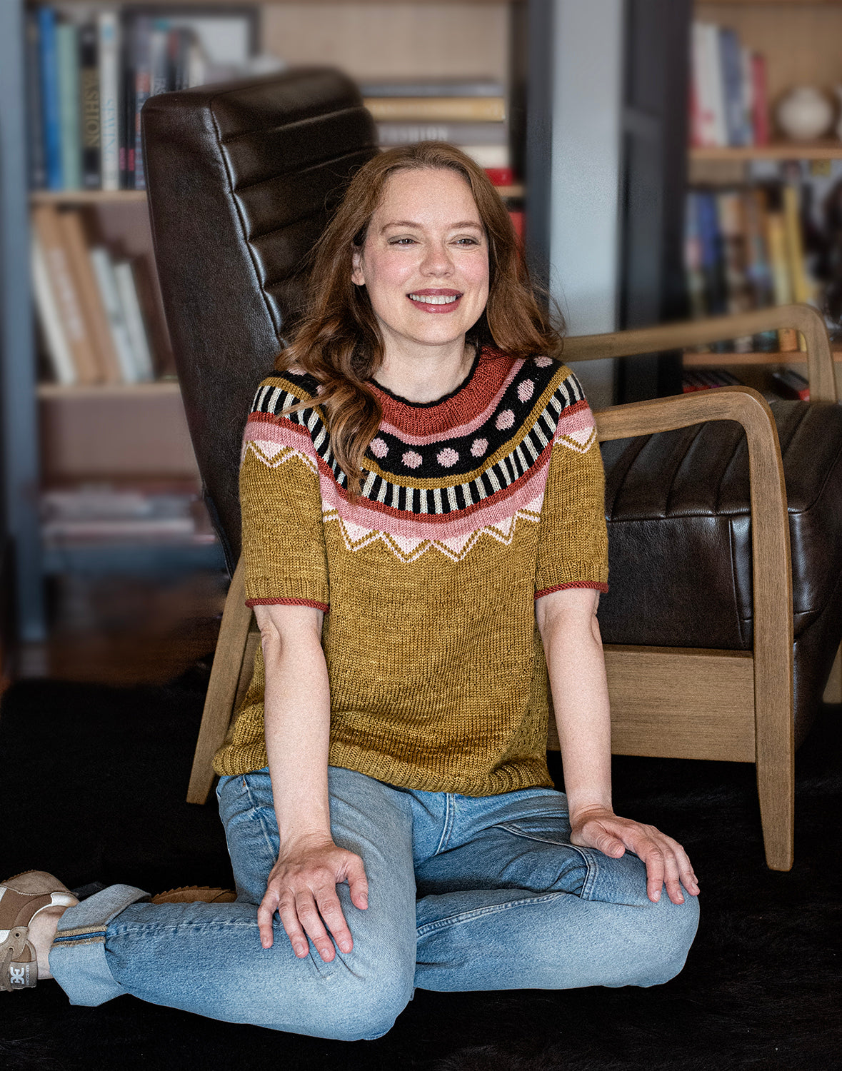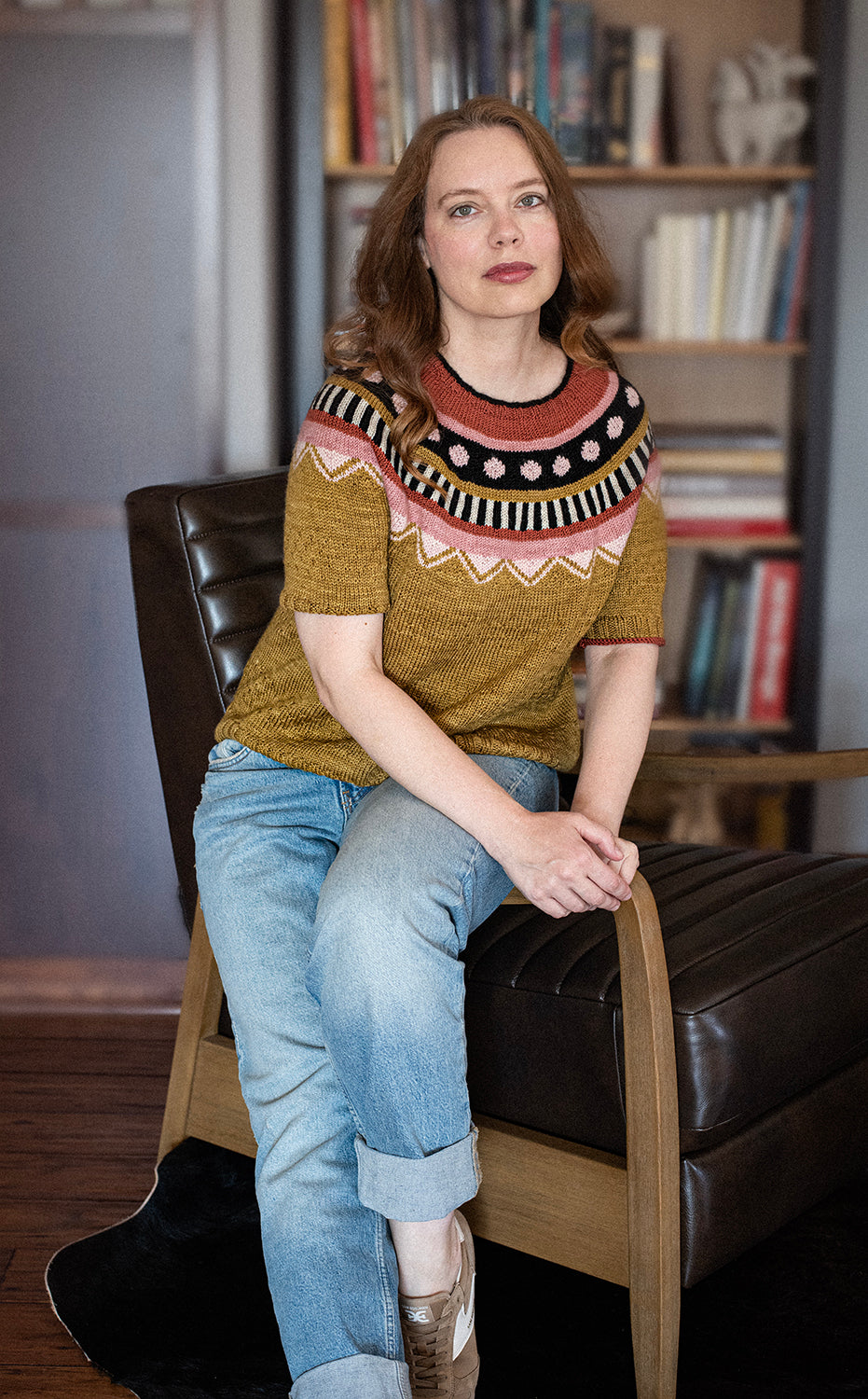 Bold colorwork and playful geometry define this short-sleeved pullover. The round yoke features striking bands of stripes, scallops, and polka-dot motifs that flow together in an eye-catching palette. Below the yoke, the body transitions into smooth stockinette with subtle textured accents, letting the vibrant upper section instantly catch attention.