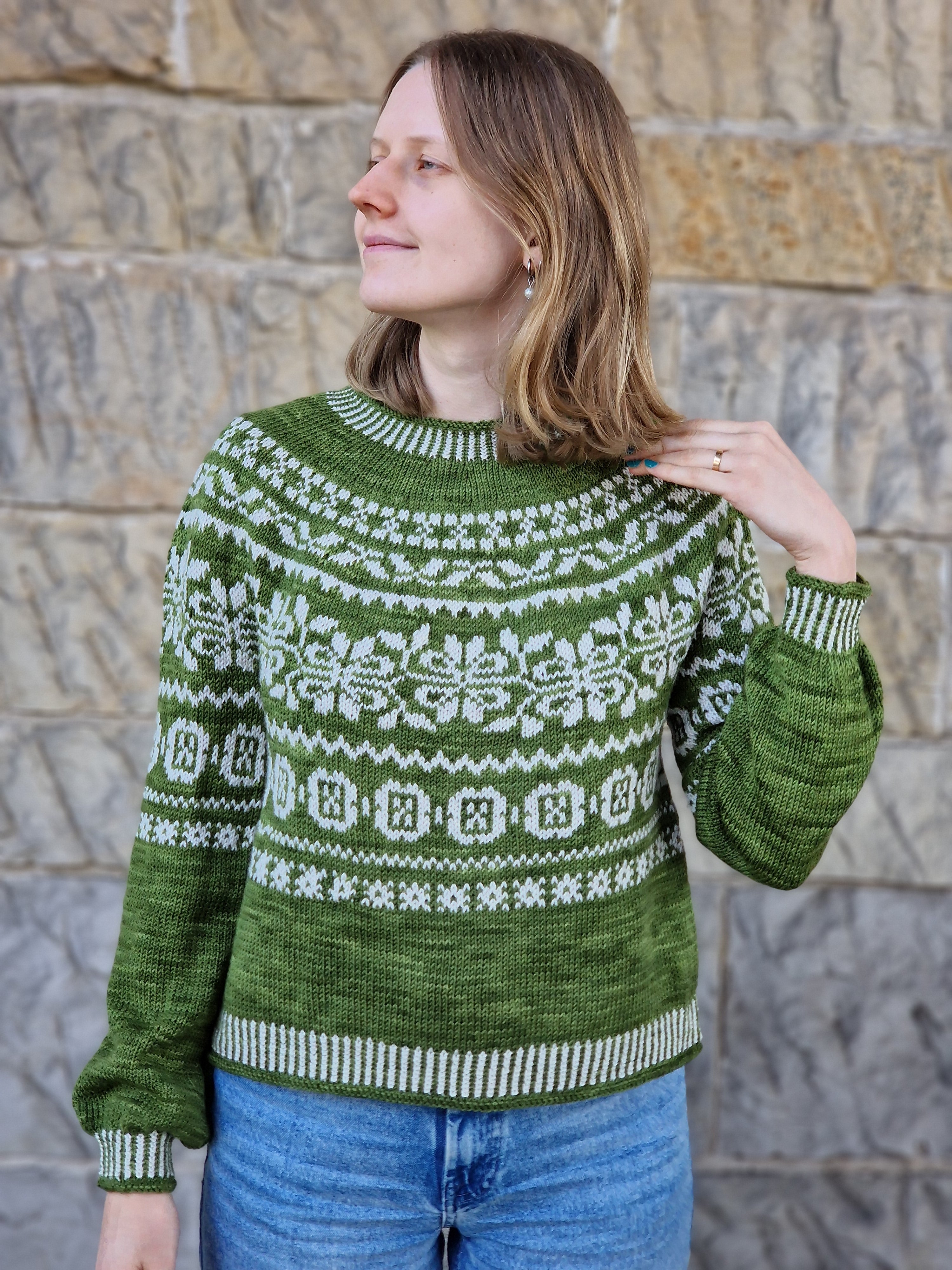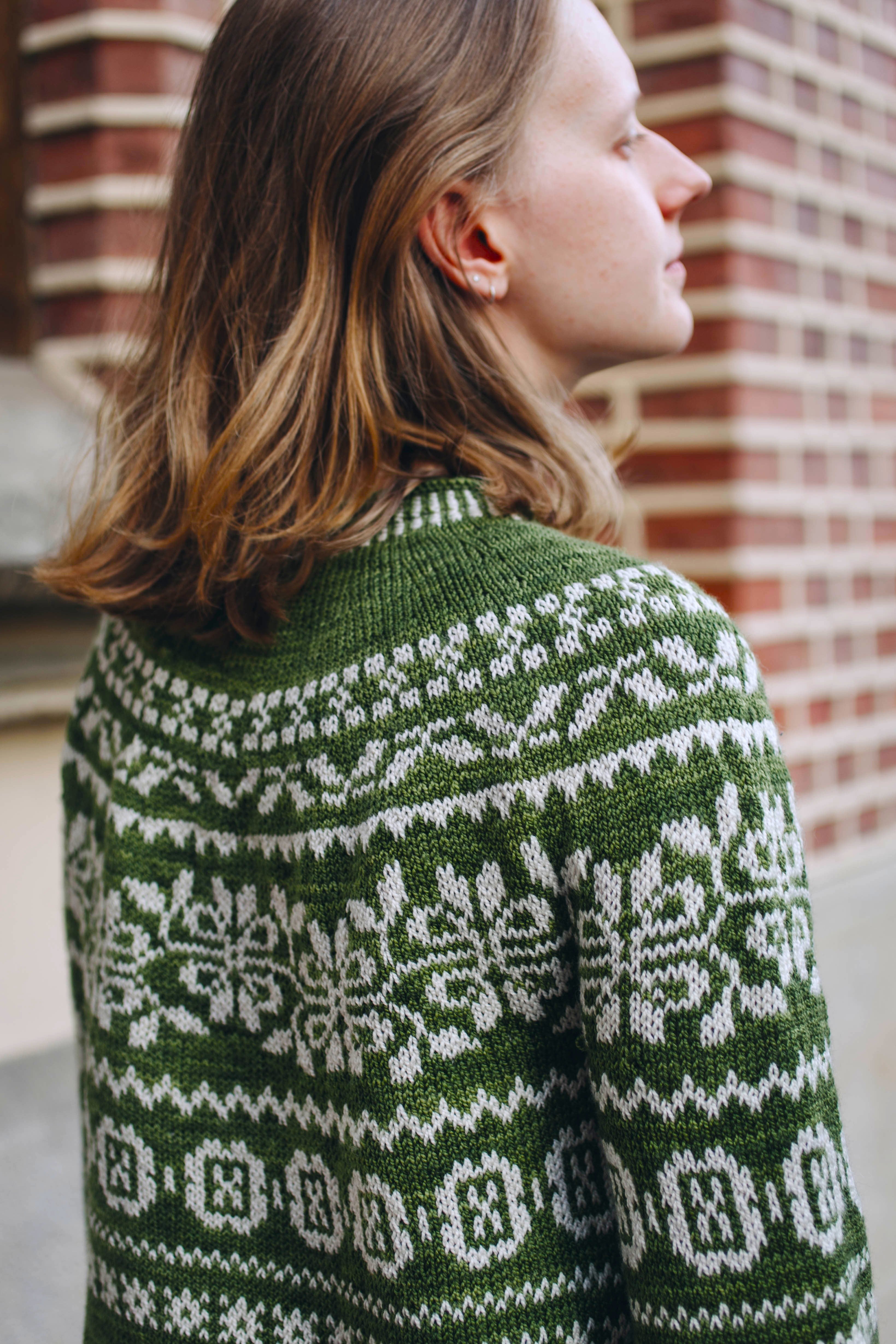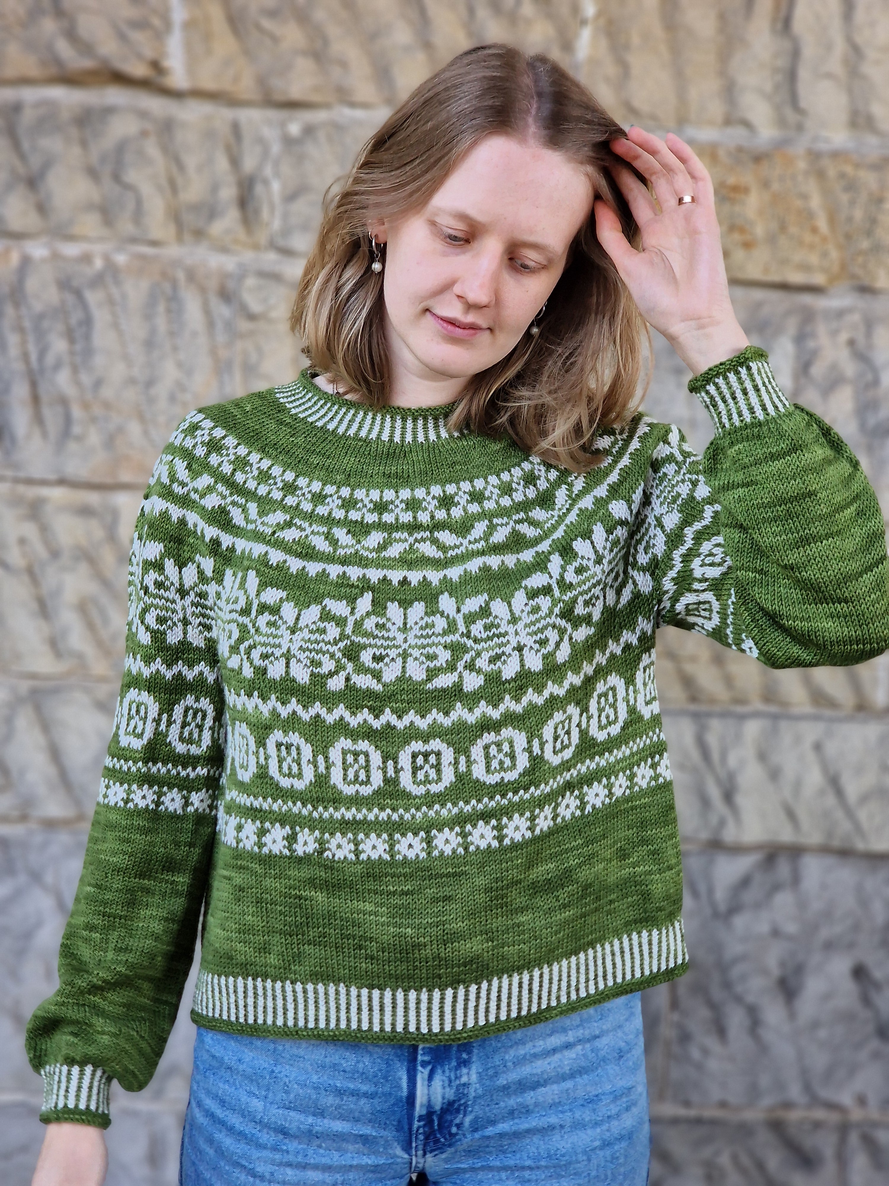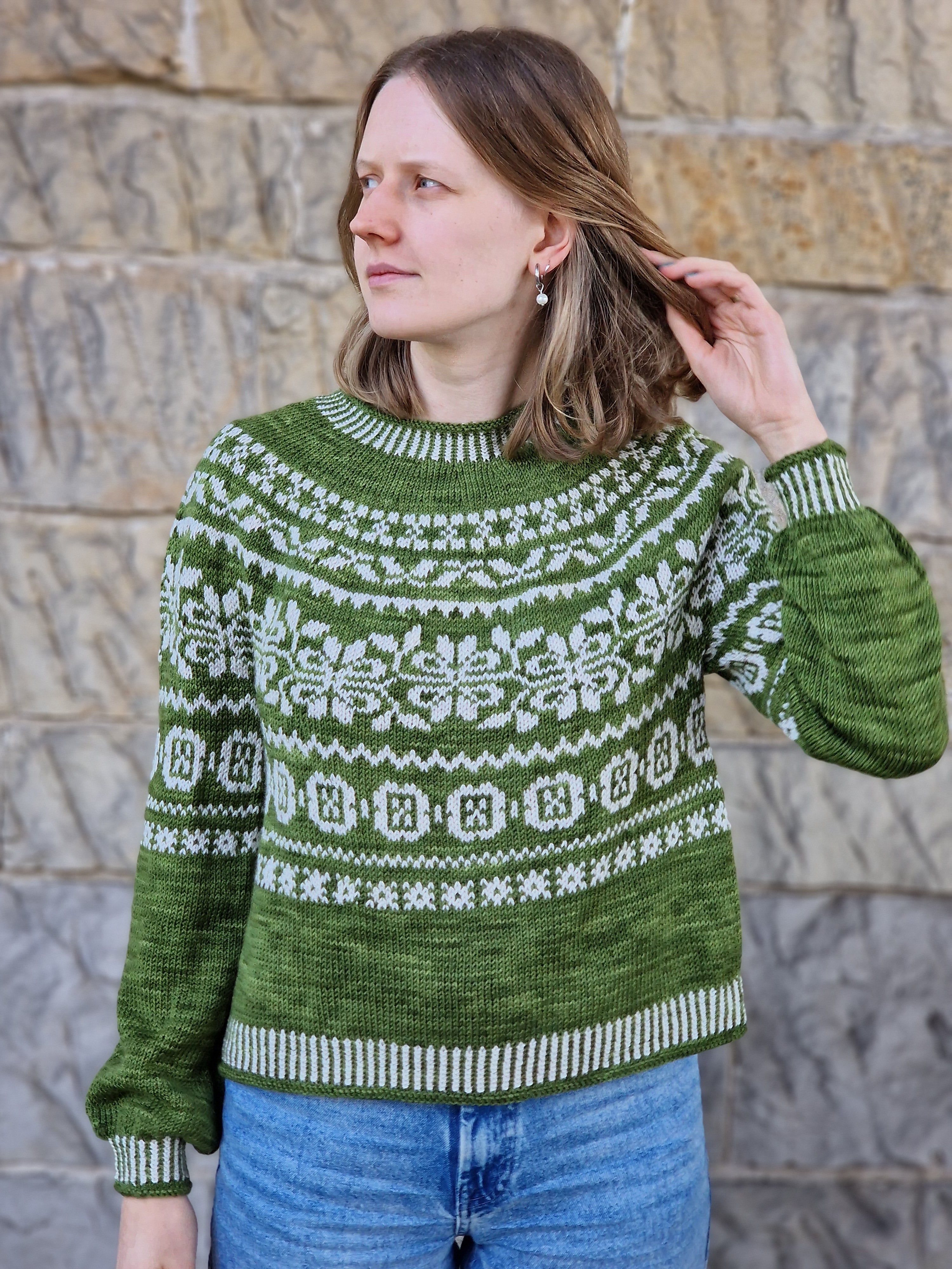 The motifs on Rozkvit were inspired by the embroidery from the Opoczno area in central Poland, which typically includes geometrical shapes and floral elements. Rozkvit is a top down seamless yoke sweater with a deep colorwork chart that uses flowers to create a playful motif. The neckline features corrugated ribbing and is followed by short rows at the back of the neck to create a comfortable fit. This is followed by stranded knitting that continues past the sleeve and body divide. The sleeves are knit in stockinette stitch, and has straight sleeves, with decreases occuring at the wrist. The cuffs and body are finished off in corrugated ribbing.
