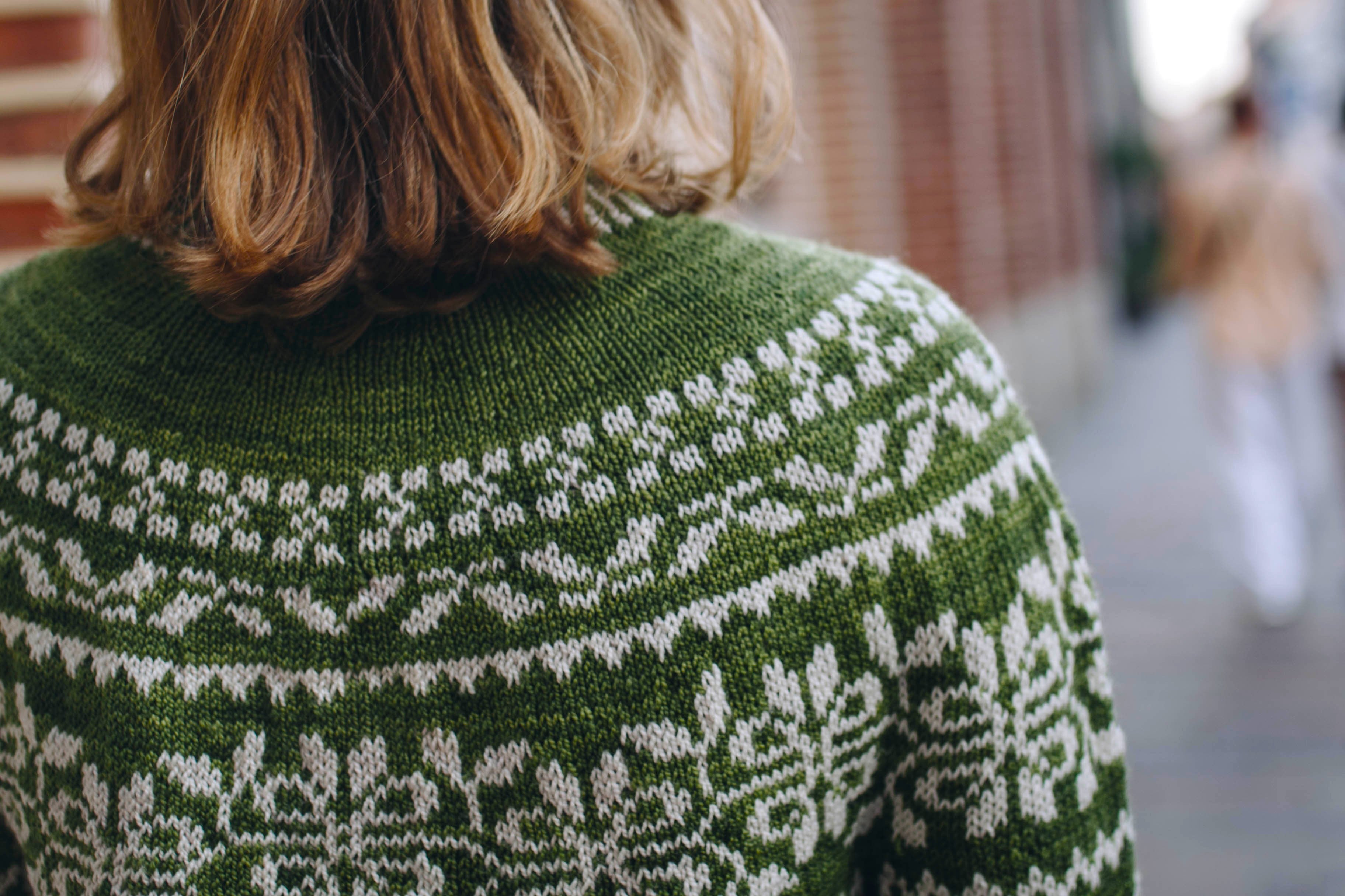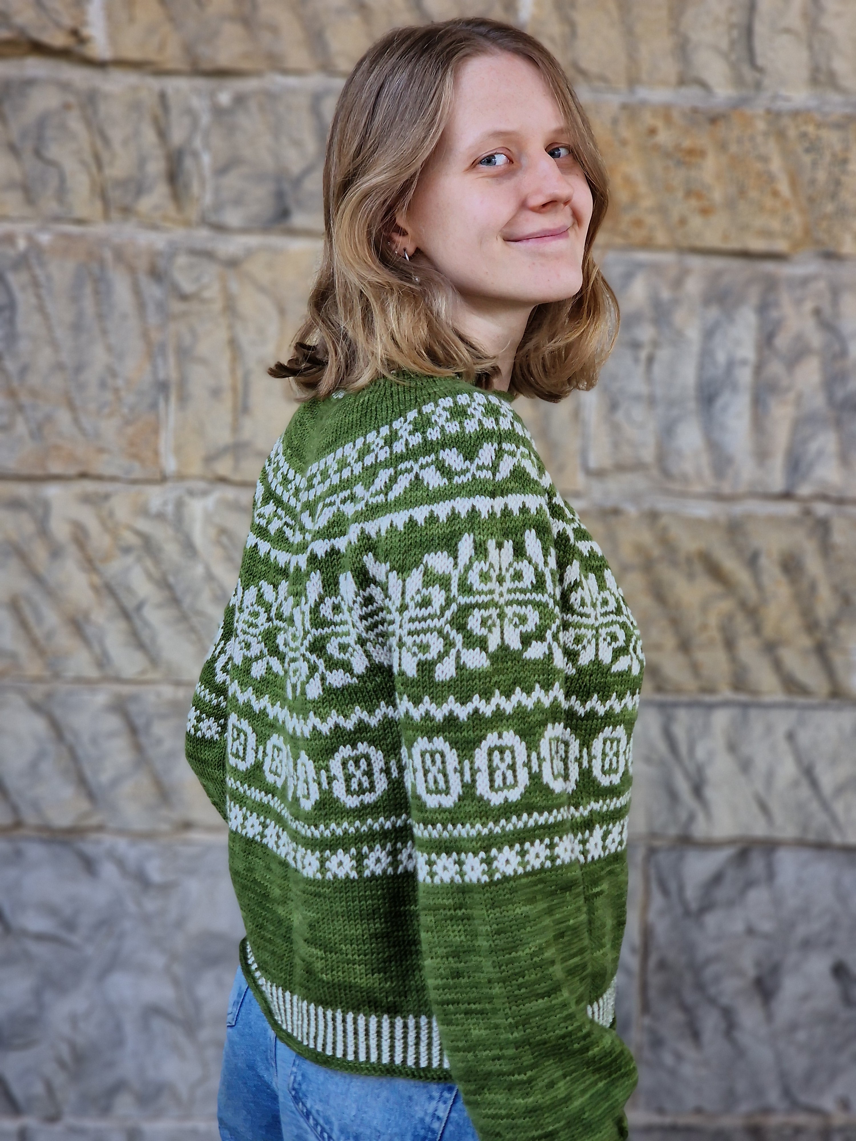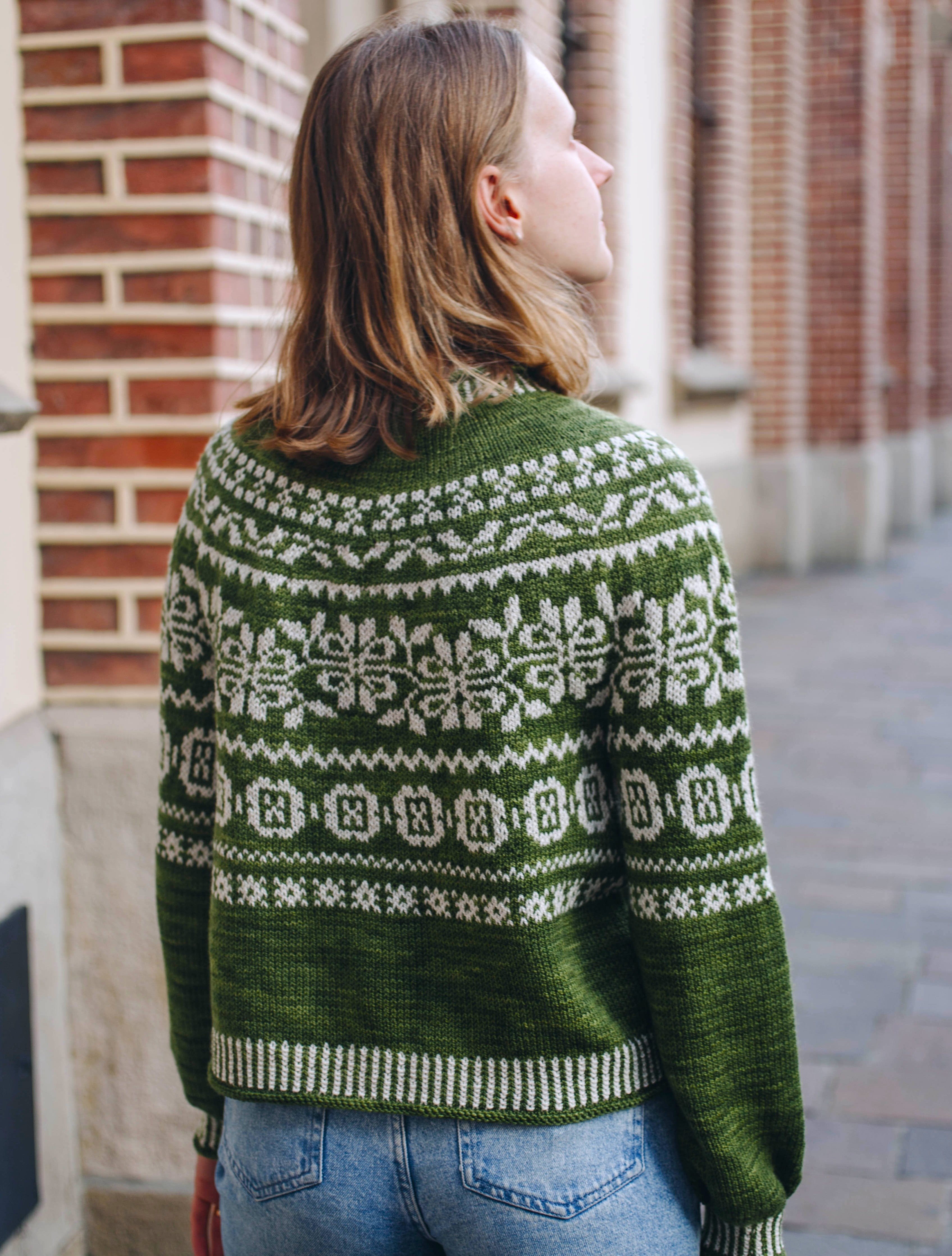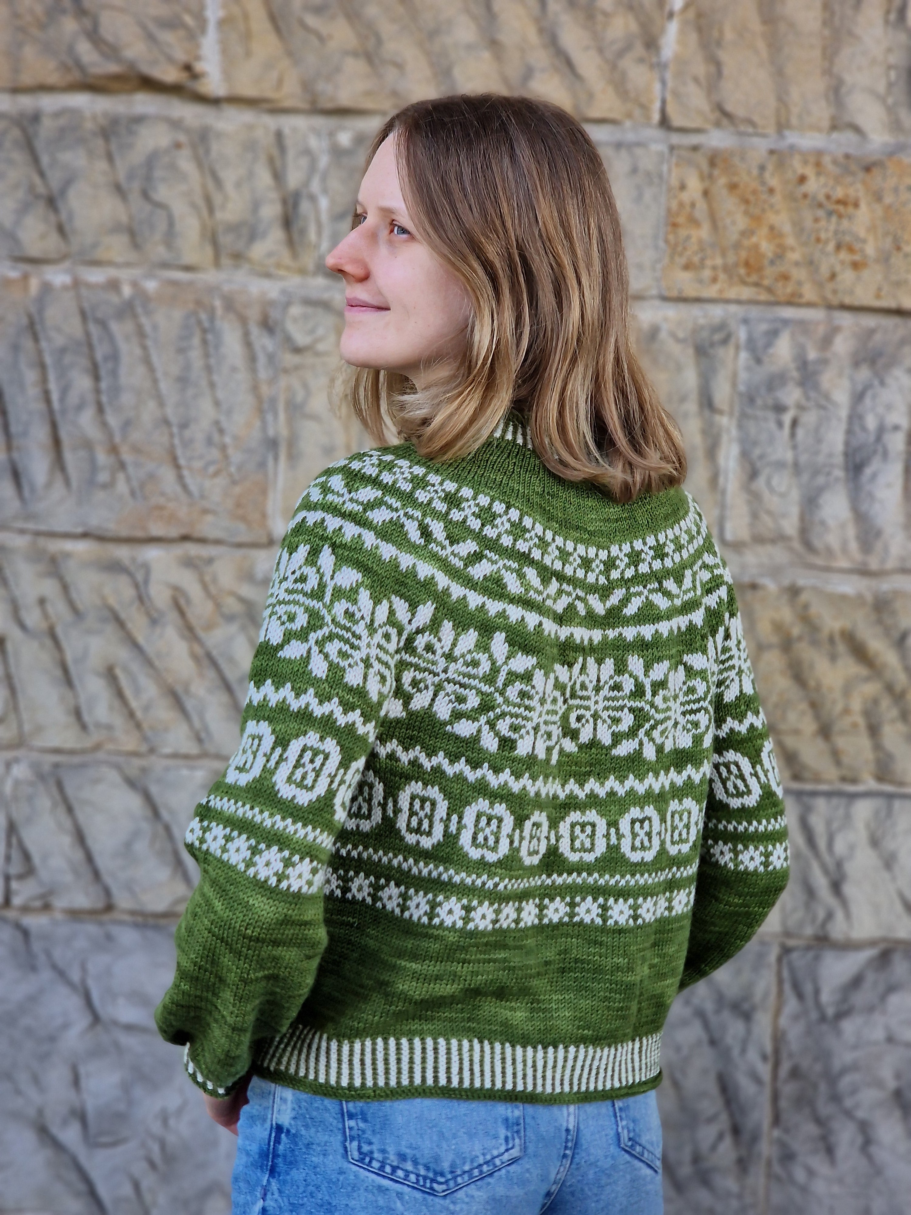 The motifs on Rozkvit were inspired by the embroidery from the Opoczno area in central Poland, which typically includes geometrical shapes and floral elements. Rozkvit is a top down seamless yoke sweater with a deep colorwork chart that uses flowers to create a playful motif. The neckline features corrugated ribbing and is followed by short rows at the back of the neck to create a comfortable fit. This is followed by stranded knitting that continues past the sleeve and body divide. The sleeves are knit in stockinette stitch, and has straight sleeves, with decreases occuring at the wrist. The cuffs and body are finished off in corrugated ribbing.