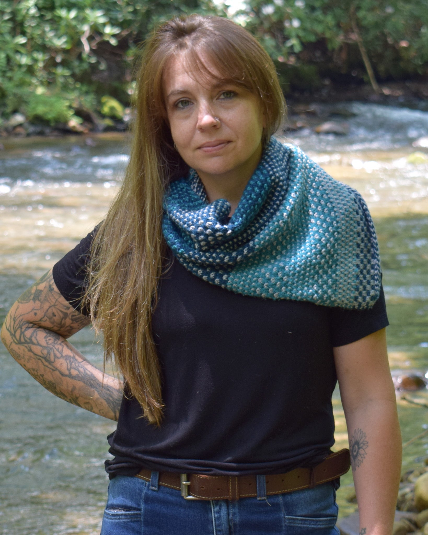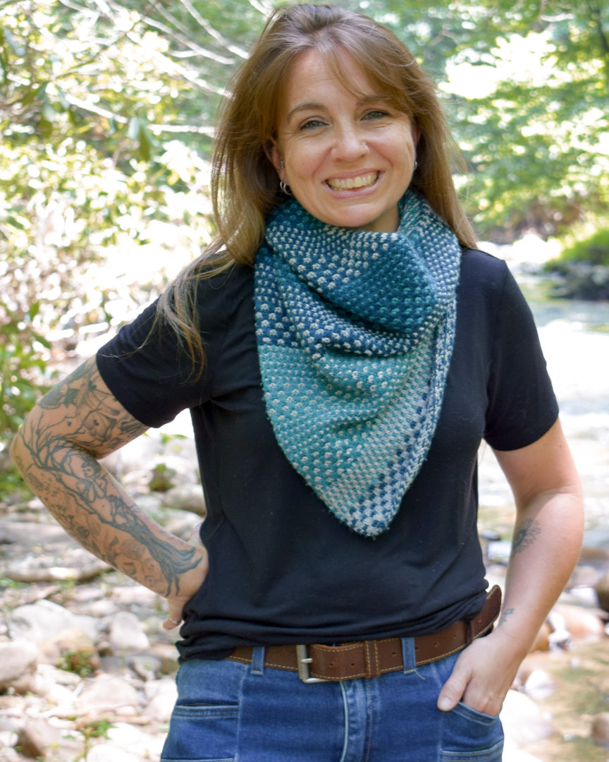 This cowl is the perfect all-the-time accessory! And the answer for all of those knitters out there who love to knit shawls, but have a hard time styling them. A fun and engaging knit with shifting colors, that looks like an asymmetrical triangle shawl, and it only takes a fiddle-free second to throw it on as the finish to every outfit!